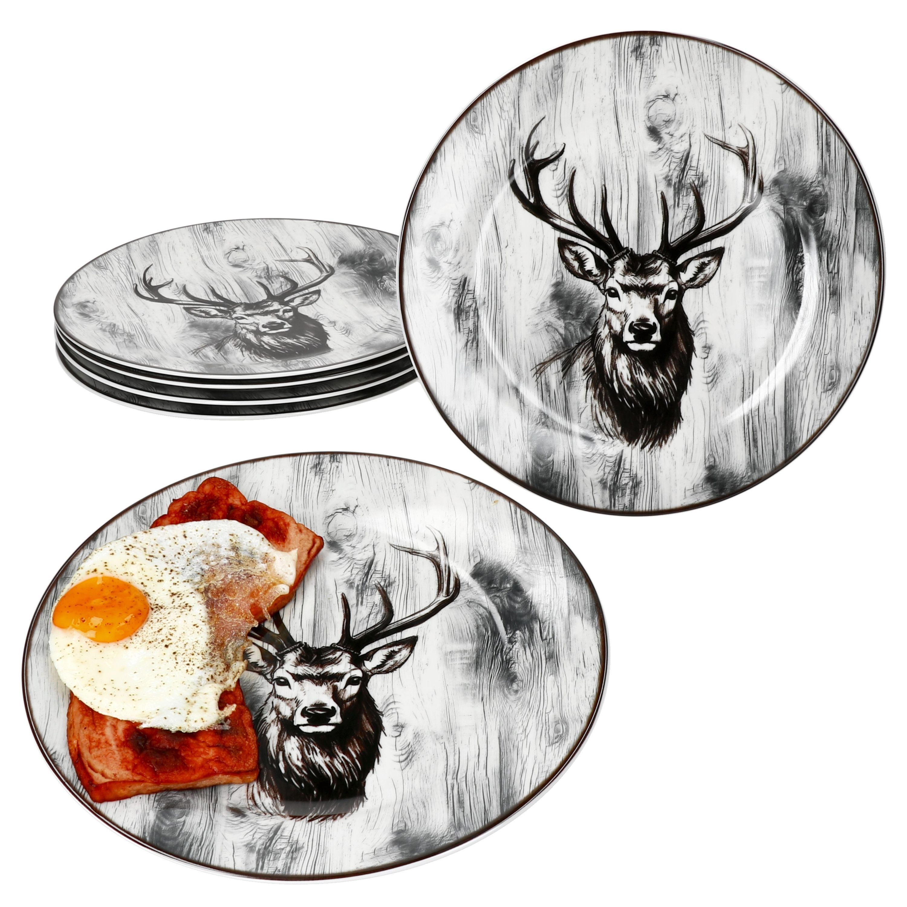 Die großen Teller verzaubern mit einer einzigartigen Holz-Optik auf der kompletten Telleroberfläche, welche mit einer außergewöhnlichen Maserung versehen ist. Auf dem Spiegel des Tellers ist zudem noch ein filigran gezeichneter Hirschkopf zu sehen, der das Gesamtbild perfekt abrundet. Das komplette Dekor ist schlicht in schwarz-weiß gehalten, wodurch das Geschirr kinderleicht mit anderen Serien oder farbigen Dekoartikeln kombiniert werden kann. Das macht das Set zu der perfekten Ergänzung beim Frühstück, Brunch, Mittag und Abendbrot. Egal ob als Käse- oder Wurstplatte, für den Braten mit Kartoffeln und Gemüse, für Reisgericht, vegetarische Spezialitäten, als Grillplatte oder für Fingerfood, diese Teller sind in jedem Fall die richtige Wahl.