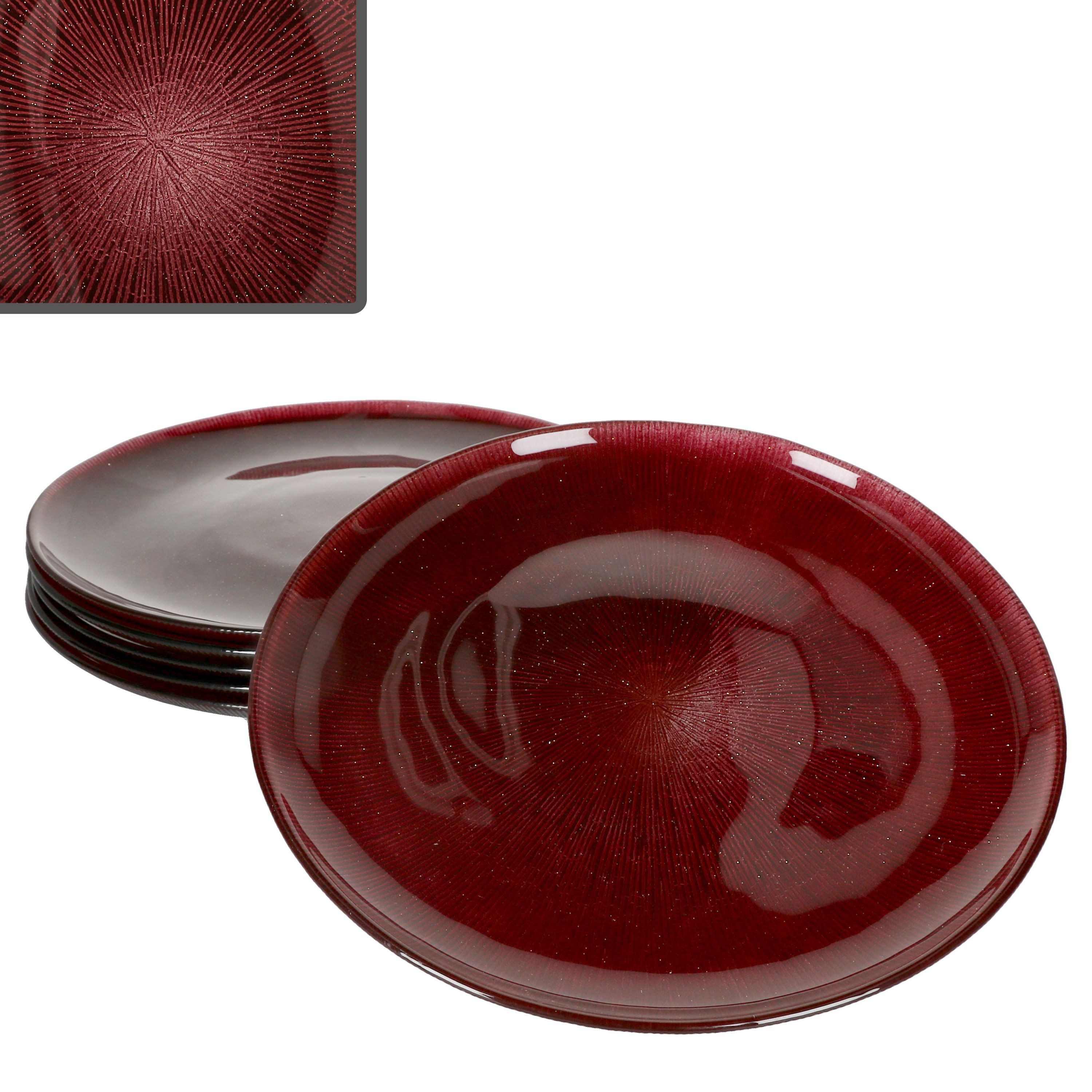 Tauchen Sie Ihre Festtafel in ein edles Licht – mit dem Suez Speiseteller. Der Teller ist aus Glas gefertigt und begeistert mit seiner tief dunkelroten Farbe, goldenen Glitzerelementen und einem feinen, radialen Relief, das dem Design Tiefe und Charakter verleiht. Oben ist der Teller durch die Glasoberfläche wunderschön glatt, was das Anrichten erleichtert und die rote Fläche wunderhübsch funkeln lässt. Die Unterseite des Tellers zeigt das gleiche Relief, jedoch ist dieses rau, wodurch der Teller ideal in der Hand liegt und nicht so leicht verrutschen kann.