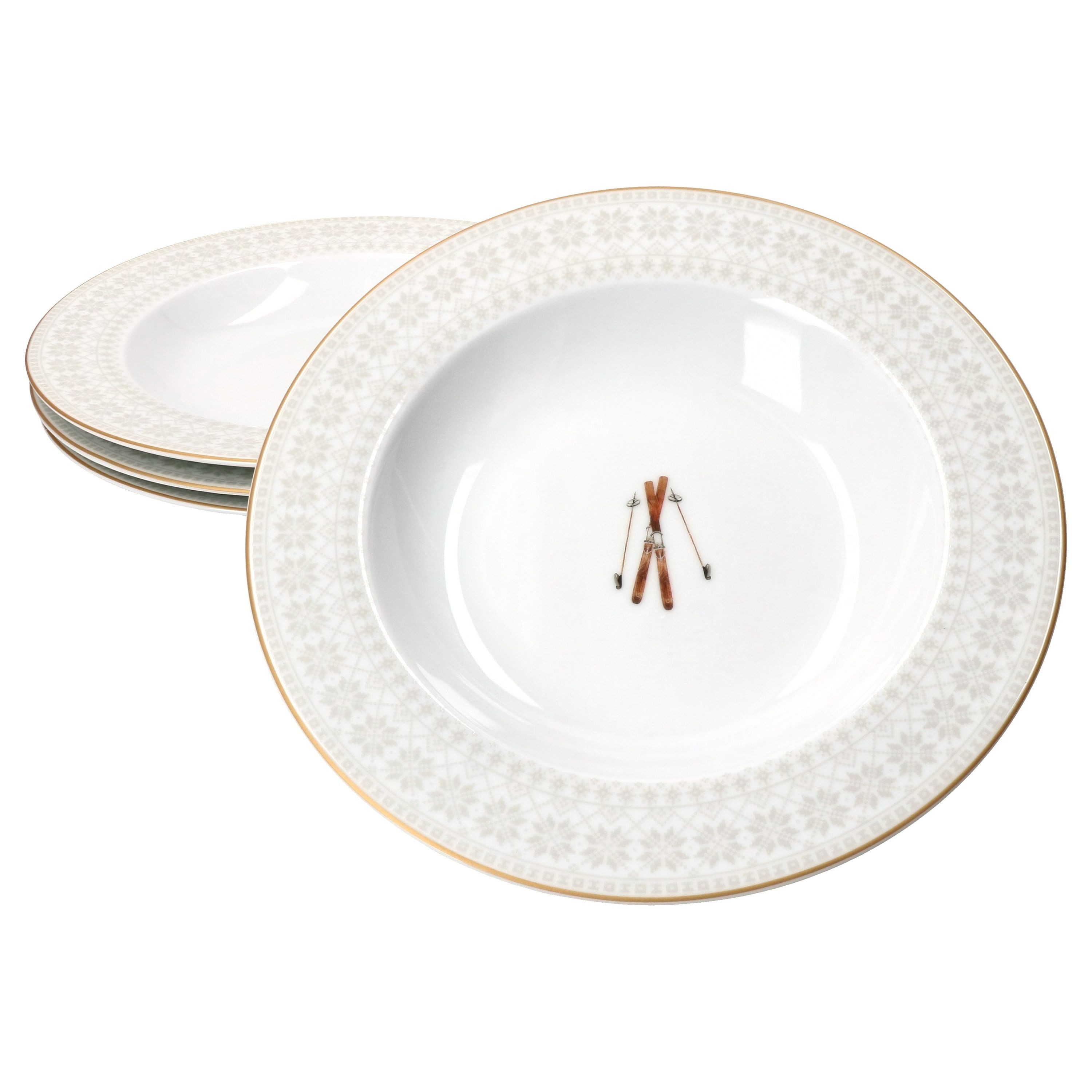 Die tiefen Teller verzaubern mit einem filigranen Motiv aus Skiern und Schickstöcken, welches das Herzstück des Dekors und in der Mitte des Tellerspiegels zu sehen ist. Der breite Rand ist mit einem hellgrauen Muster versehen, das in der Art eines Strickmusters gehalten ist. Das Ganze wird von einer feinen Linie ganz außen am Rund umschlossen. Das macht das Set zu der perfekten Ergänzung beim Frühstück, Brunch, Mittag und Abendbrot.