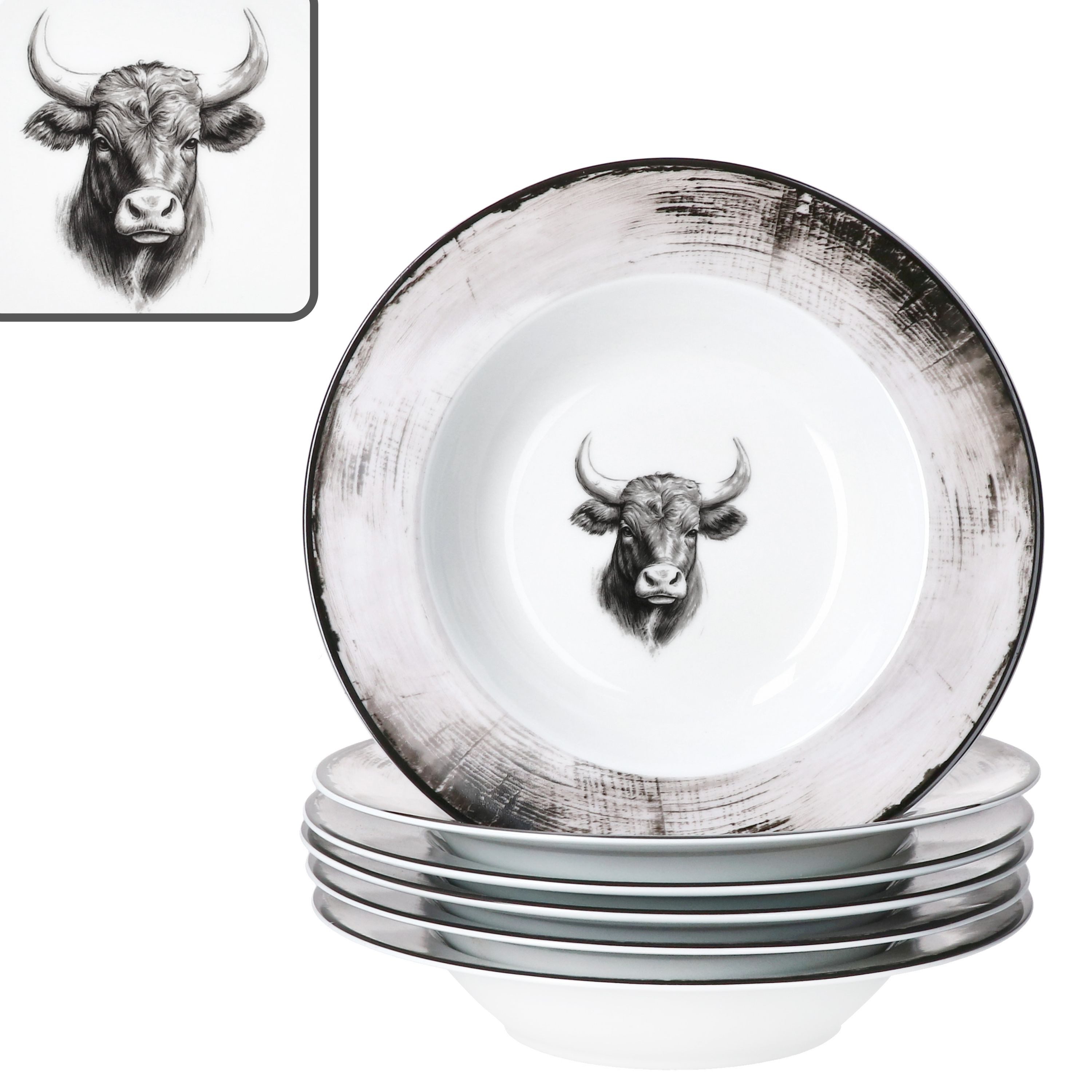 Der Suppenteller TORO bringt kraftvolle Ausdrucksstärke auf den Tisch. Das Hauptmotiv – ein eindrucksvoller Rinderkopf – ist in detailreicher Schwarz-Weiß-Illustration in der weißen Mitte des Tellers platziert. Die leicht strukturierte Hintergrundoptik am Tellerrand erinnert an gebürstetes Holz und sorgt für einen besonders natürlichen Look. Diese wirkt je nach Lichteinfall hellrosa bis cremefarben und sorgt für eine warme Atmosphäre auf dem gedeckten Tisch.