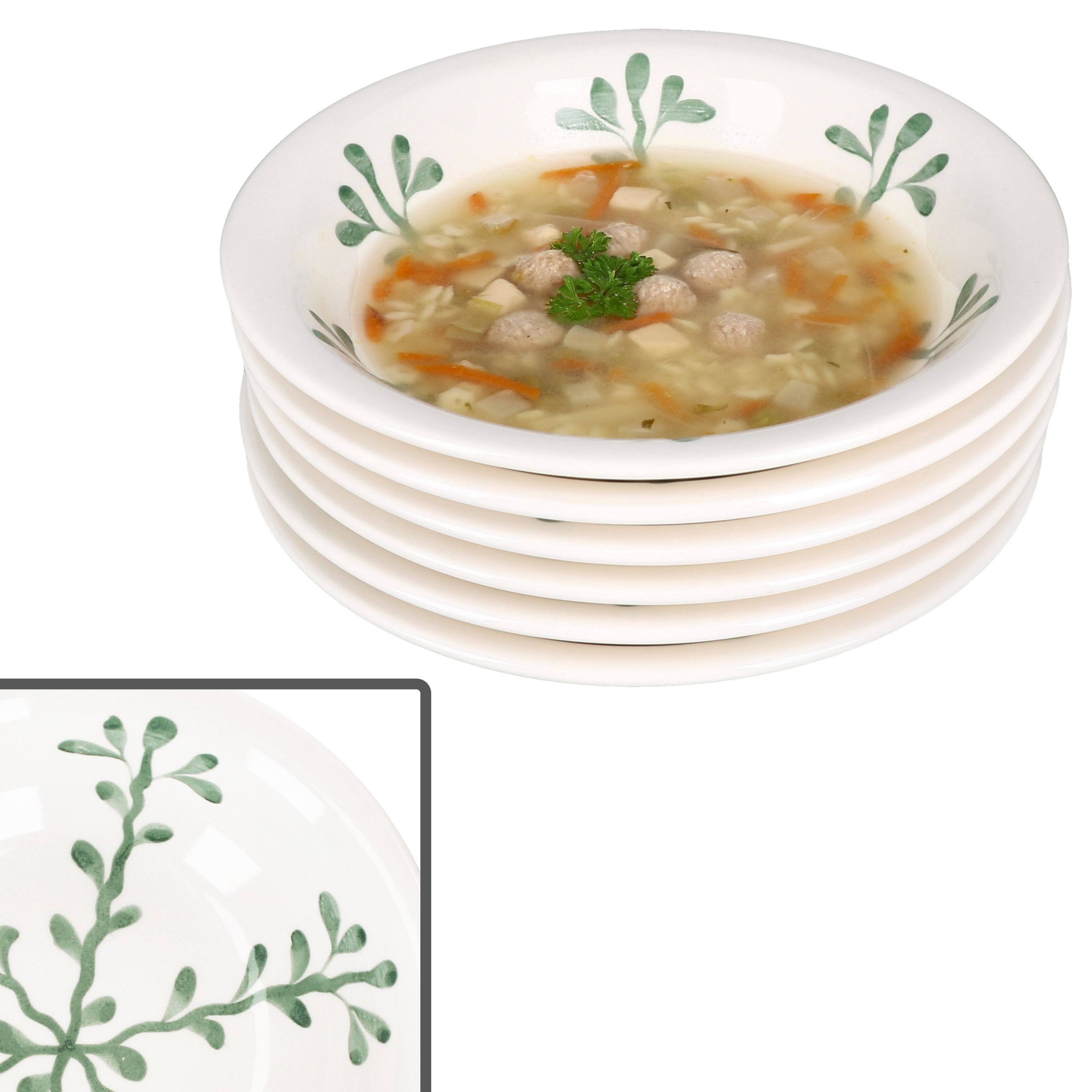 Der tiefe Teller hat einen aufsteigenden Rand und ist in einem cremefarbenen Grundton gehalten. Von der Mitte des Tellers verlaufen grüne abstrakte Tannenzweige in einer sternenartigen Form zum Rand, wodurch die Teller eine ganz besondere Anmutung erhalten und für traumhaft schöne Akzente auf Ihrem Tisch sorgen.