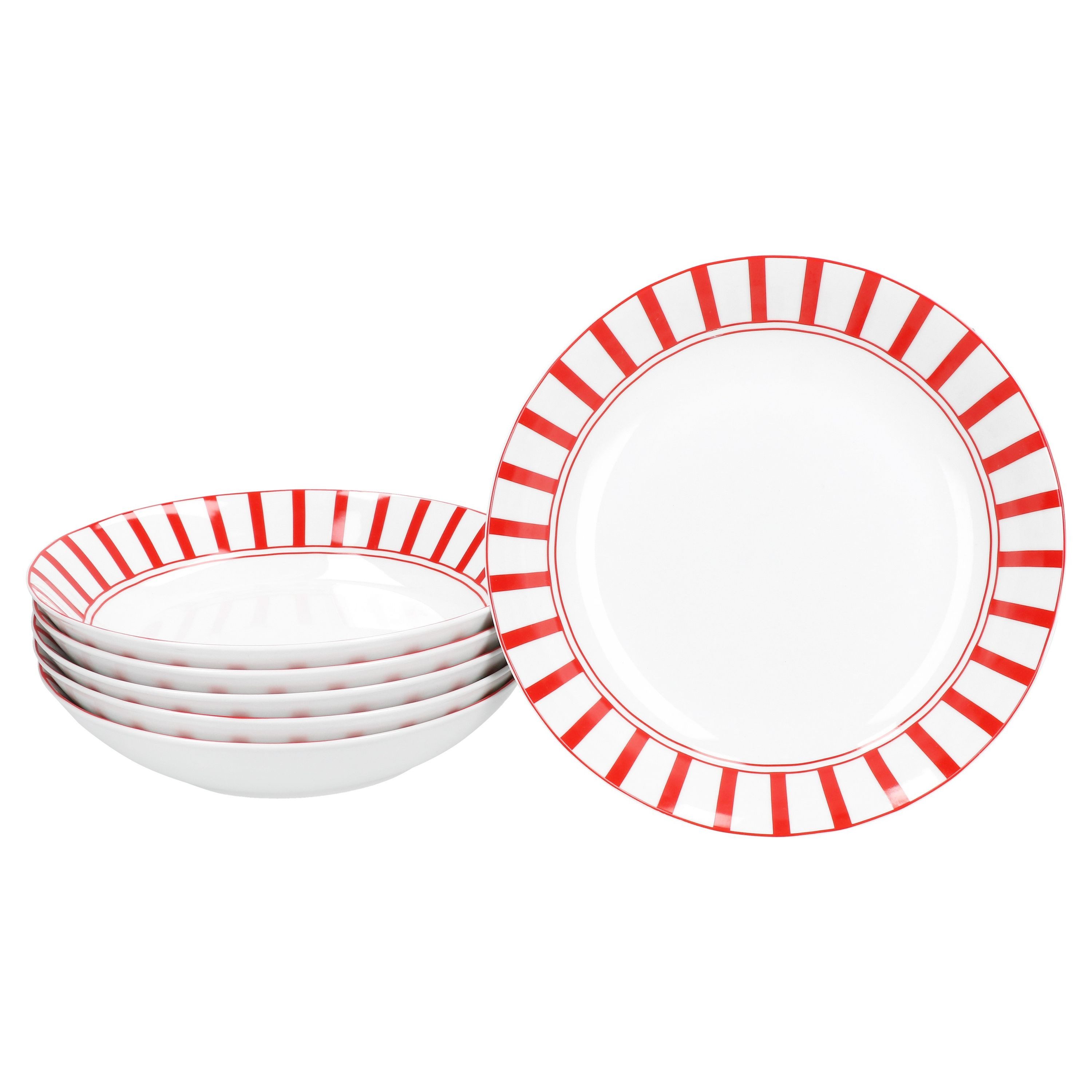 Die tiefen Teller sorgen durch das gestreifte Design für eine freundliche und zugleich lebhafte Atmosphäre. Die Unter- und Oberseite sind schlicht in Weiß gehalten und verzaubern innen am Rand mit roten Streifen, die zur Tellermitte verlaufen. Am Ende der Streifen sind zwei Kreise in Rot, die das Ende markieren und dadurch das Dekor perfekt abrunden. So ist das Set die perfekte Ergänzung beim Frühstück, Brunch, Mittag und Abendbrot.