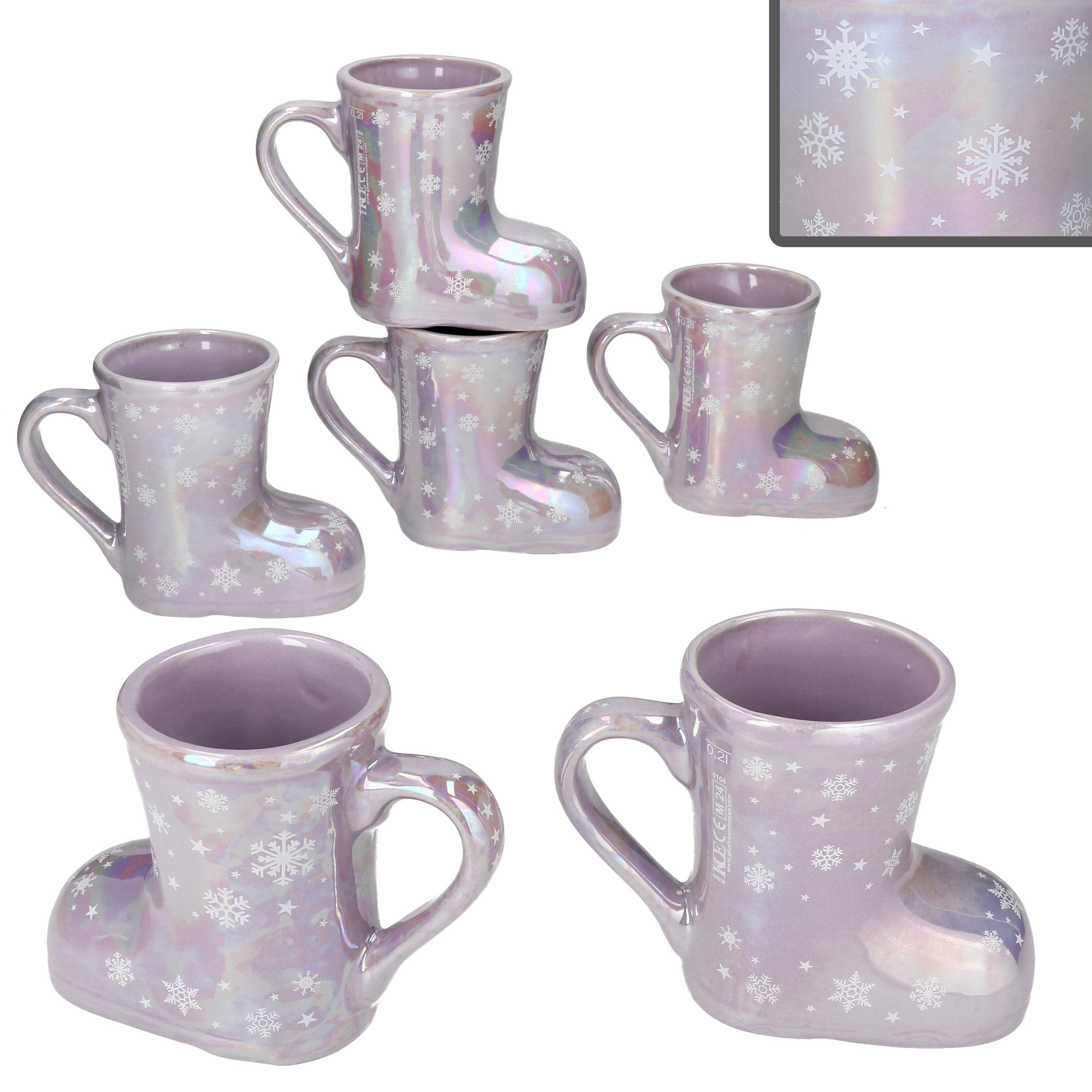 Die Stiefel sind in einem pastellfarbenen Violett gehalten und mit weißen kleinen und großen Sternen und Schneeflocken verziert. Das Besondere jedoch ist der traumhaft schöne Perlmutt-Schimmer, der sich über die komplette äußere Fläche ziert und so für glanzvolle Momente und ein einzigartiges Erscheinungsbild sorgt.