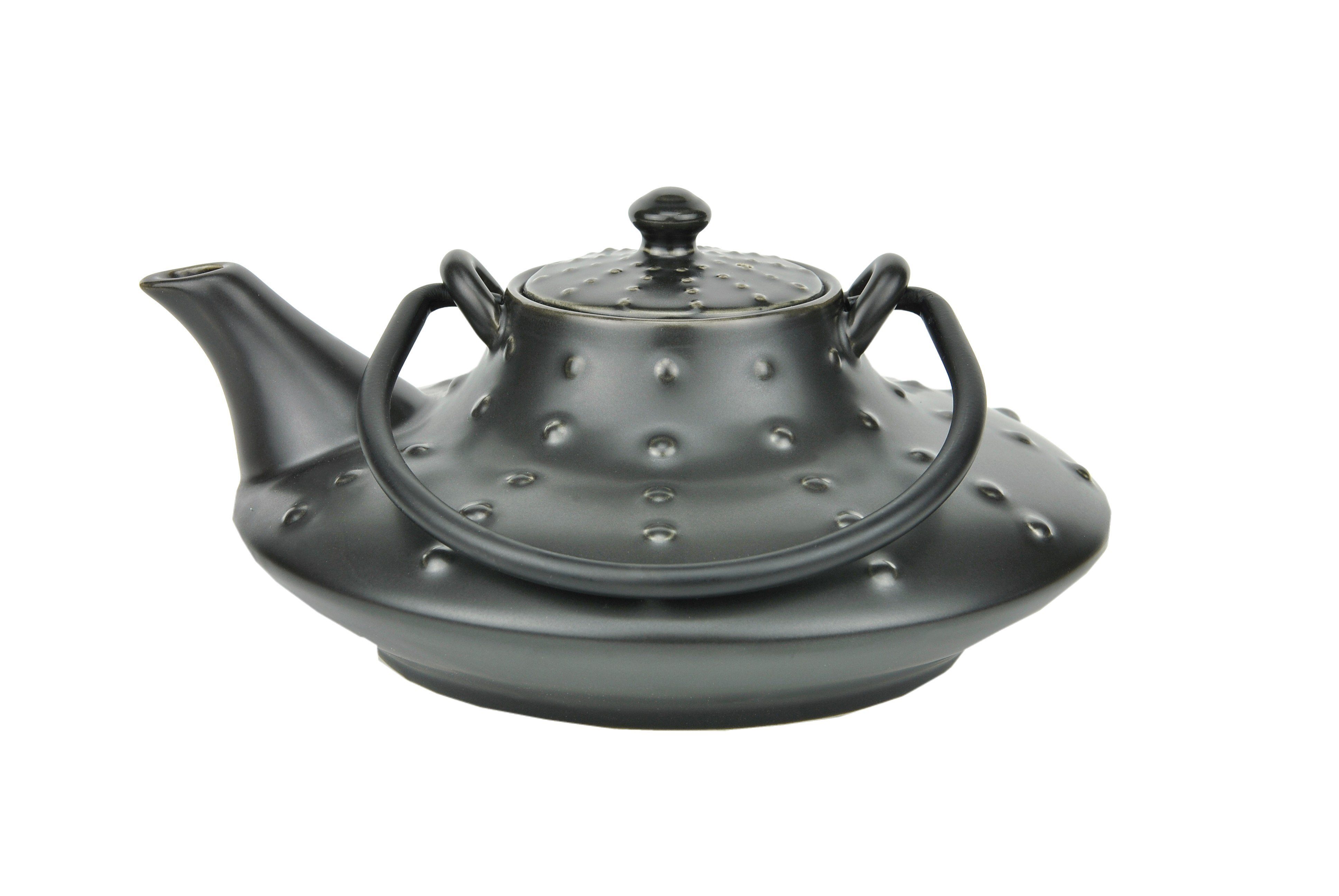 Die gesamte Teekanne erstrahlt in einem matten чёрный und die Oberseite ist mit mehreren Noppen in einer Reihe verziert worden. Die Noppen werden von außen zum Deckel hin immer kleiner und an manchen Stellen schimmern sie etwas heller. Der halbrunde Henkel ragt über die Kanne und besteht aus robustem Metall. Er ist schwarz und ermöglicht ein angenehmes tragen der Teekanne. Im Deckel befindet sich ein kleines Loch, damit der heiße Dampf entweichen kann und man sich nicht verbrennt, wenn man den Deckel anhebt.
