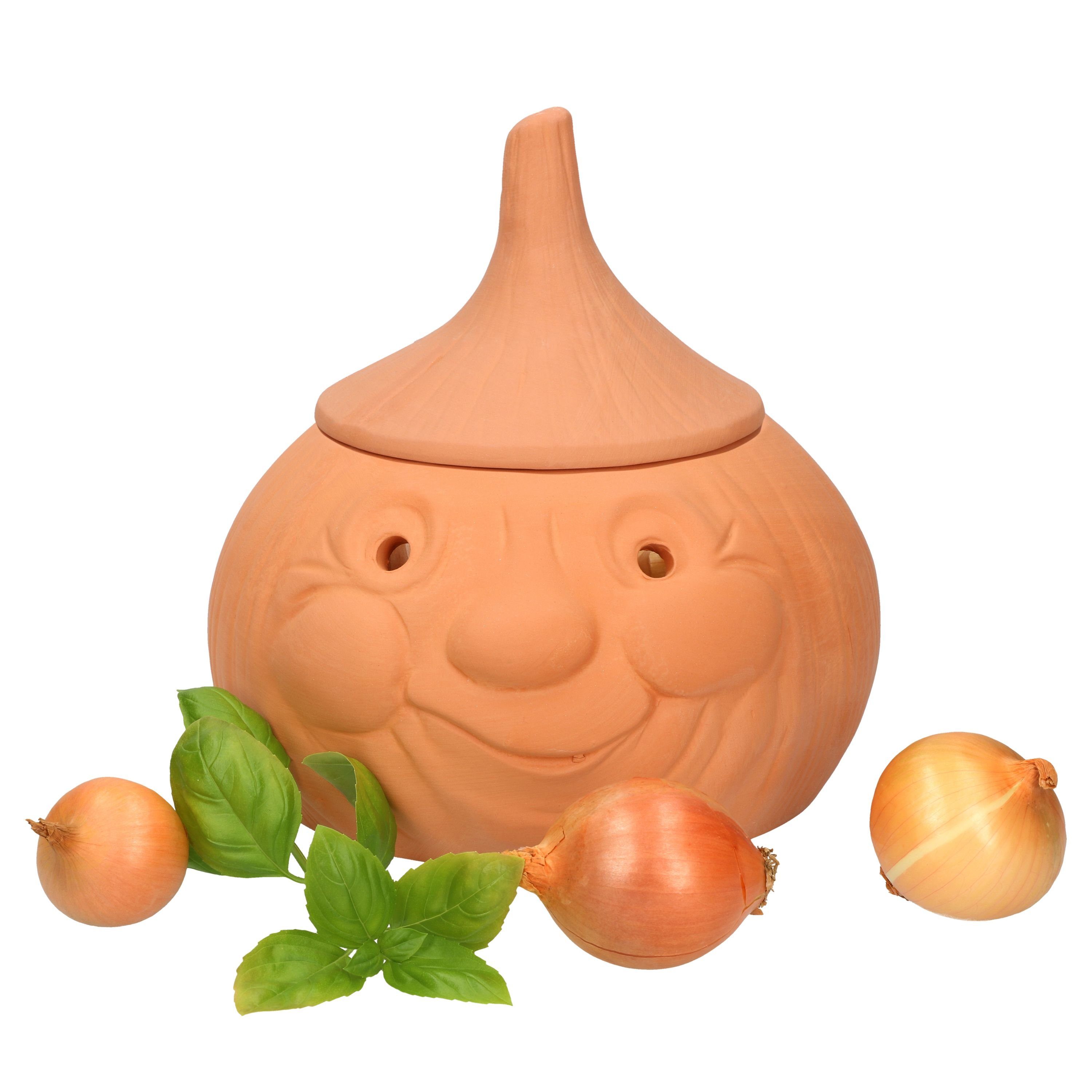 Der super schöne Aufbewahrungsbehälter in witziger Zwiebelform, zaubert nicht nur ein Lächeln ins Gesicht, sondern sorgt vor allem für die optimale Lagerung von Lauch und Knollengemüse. Ca. 900 g fasst das dickwandige Gefäß aus echter Terrakotta und schützt zugleich Ihre Lebensmittel vor Licht und Feuchtigkeit. Durch die eingearbeiteten Öffnungen in den Augen und auf der Rückseite entsteht die ideale Luftzirkulation, die Keimbildung verhindert und Inhalte länger frischhält.