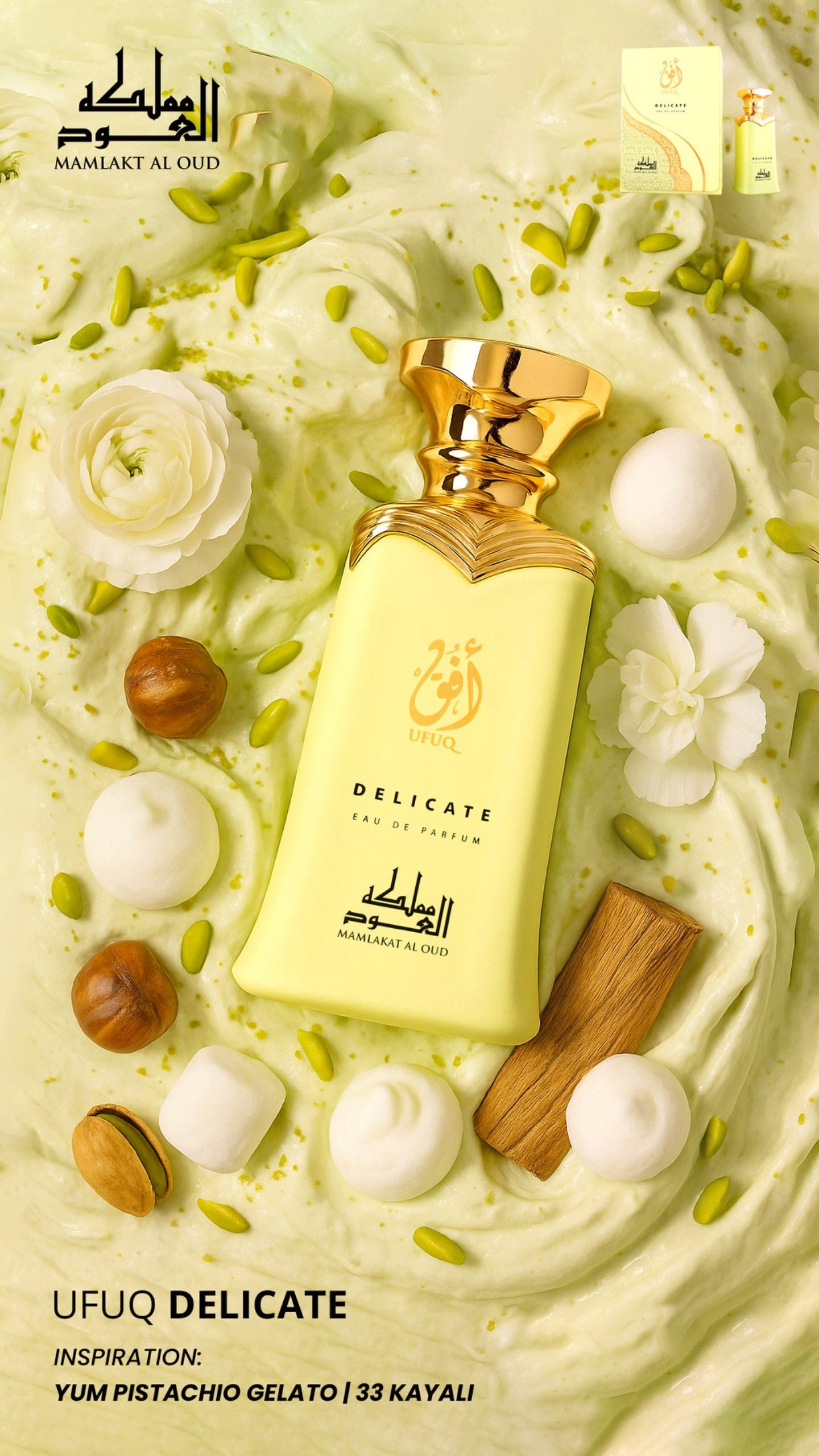 Pistachio Gelato, Hazelnut, Sweet Rum, Cardamom Middle Notes : Jasmine, Peony, Raspberry, White Peach Base Notes : Whipped Cream, Marshmallow, Cotton Candy, Turkish Delight Pistazien-Eis prickelt über einer üppigen, blumig-fruchtigen Herznote und einem nachtischweichen Abgang. Süß, fröhlich, unvergesslich. UFUQ Delicate vereint cremiges Pistazien-Eis mit Haselnuss, einem Hauch von süßem Rum und warmem Kardamom. Jasmin und Pfingstrose schweben in der Herznote über saftiger Himbeere und weißem Pfirsich. Das Finale ist purer Genuss: Schlagsahne, Marshmallow, Zuckerwatte und türkischer Honig verschmelzen zu einer weichen, langanhaltenden Duftnote. Ein strahlender Gourmand, der tagsüber verspielt und abends gemütlich ist. 100 ml EDP,