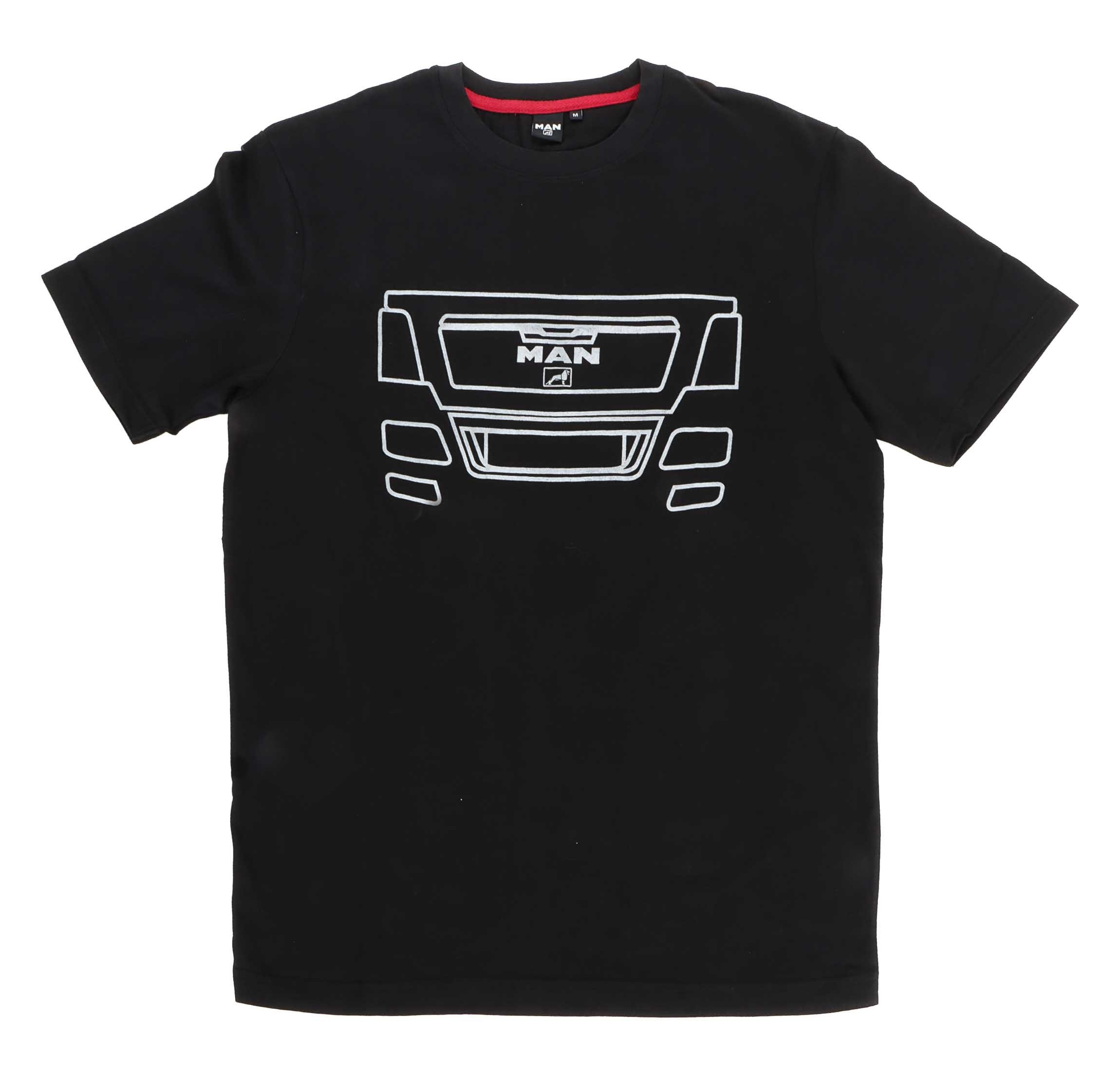 Das Lieblingskleidungsstück mit einem klaren "Ja" zum LKW und insbesondere zu MAN. Der Frontprint zeigt eine reduzierte LKW-Front und auf dem Nacken ist nochmal ein kleiner MAN-Schriftzug mit Löwen zu sehen. Das klassische Rundhals-T-Shirt ist hochwertig verarbeitet und lässig gerade geschnitten. Die gute Verarbeitung zeigt sich auch an den doppelten Nähten am Saum und an den Ärmeln. Ein Nackenband sorgt für guten Sitz und die weiche Baumwolle für angenehmen Griff. Mit seinem runden Halsabschluss und den kurzen Ärmeln bietet es einen optimalen Tragekomfort. Schwarz ist die T-Shirt schlechthin und bietet auch hier den besten Kontrast für die MAN-Symbole und ist aber auch als Arbeitskleidung meist sehr gut geeignet.