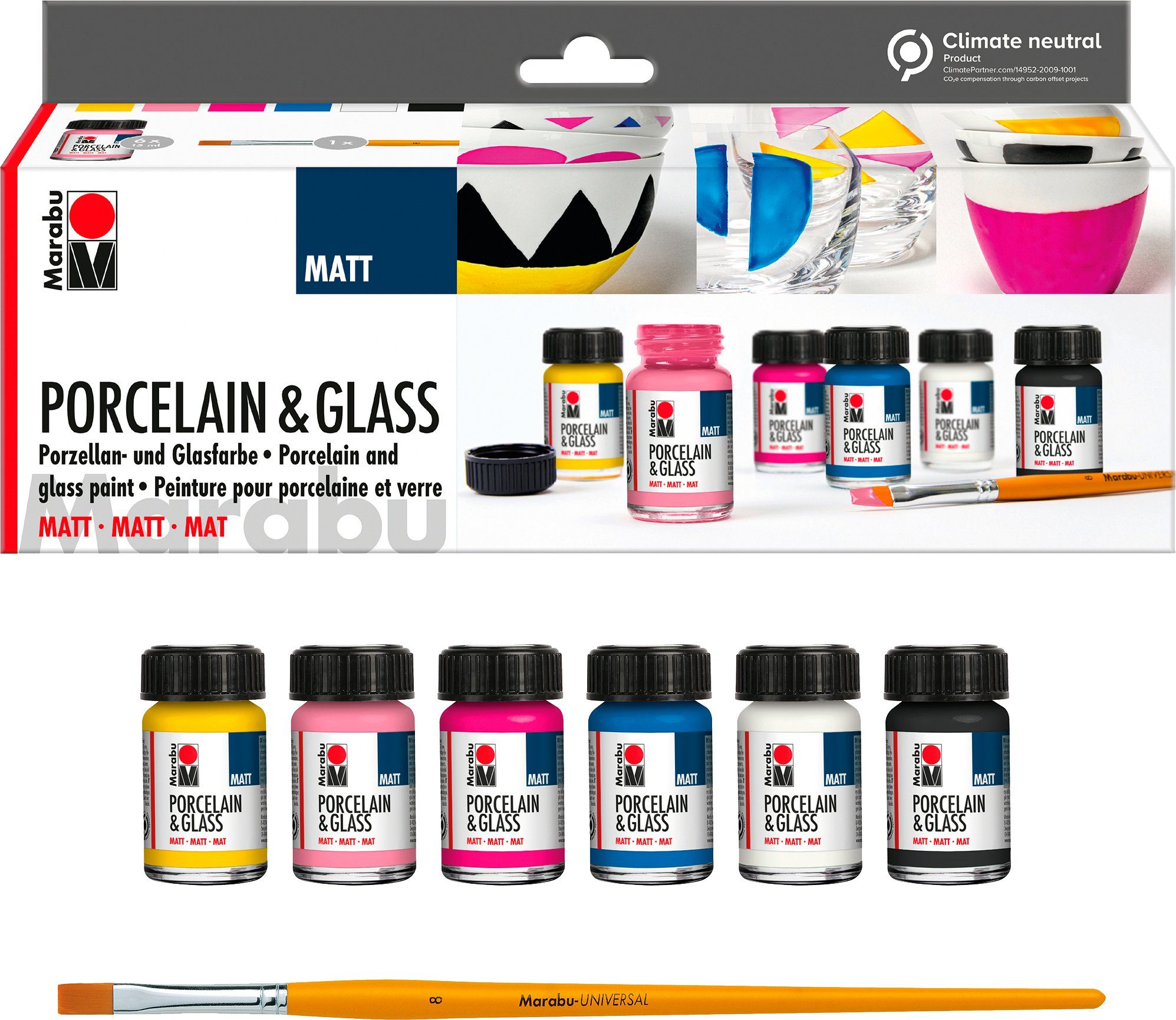 Du möchtest dein Porzellan und Glas mit einem matten Finish verschönern? Mit dem Marabu Porcelain & Glass 'Starterset - Matt' ist das ganz einfach. Ob Porzellan, Keramik, Glas oder Acrylglas, ob farbenfroh oder Ton in Ton - das Set beinhaltet alles, was du für dein Projekt benötigst. 6 matte Basisfarben (Sonnengelb, Rosa, Himbeere, Enzian, Schwarz und Weiß) sowie einen Universalpinsel machen es dir leicht, dein Porzellan und Glas neu zu gestalten. Die matt auftrocknende Porzellan- und Glasmalfarbe ist auf wasserbasis, geruchsneutral und lichtecht. Nach dem Malen und Trocknen ist dein Service spülmaschinenfest (max. 50 °C). Wenn du einbrennen möchtest, kannst du die Farbe auch mit dem Marabu Porcelain & Glas Painter kombinieren (Einbrennbar: 160 °C/30 Min.). Mit dem Marabu Porcelain & Glass 'Starterset - Matt' kannst du dein Porzellan und Glas ganz einfach selbst neu gestalten - malen, trocknen lassen und fertig!