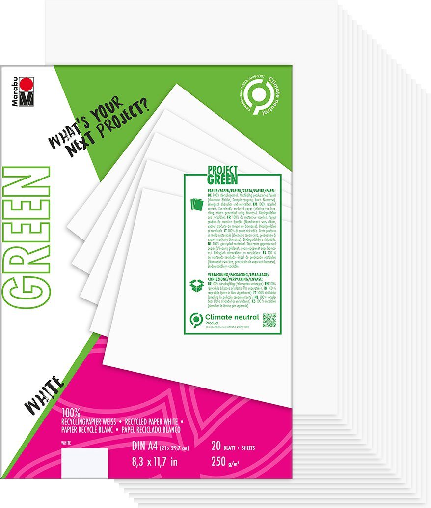 Marabu Green Papierblock White im Format DIN A4, Grammatur ca. 250 g/m², 20 Blatt in der Farbe Weiß. Das Papier hat eine matte, haptische Oberfläche und einen Recyclinganteil von mindestens 40 %. Hergestellt aus Anteilen von Rückständen organischer Produkte aus der Agrar- und Nahrungsmittel-Herstellung (Mais, Zitrusfrüchte, Trauben, Kiwi, Mandeln). Das Papier ist biologisch abbaubar, recycelbar und nachhaltig produziert. Perfekt für Kunst- und Kreativ-Projekte. Ein tolles Papier mit einer ganz speziellen Charakteristik.