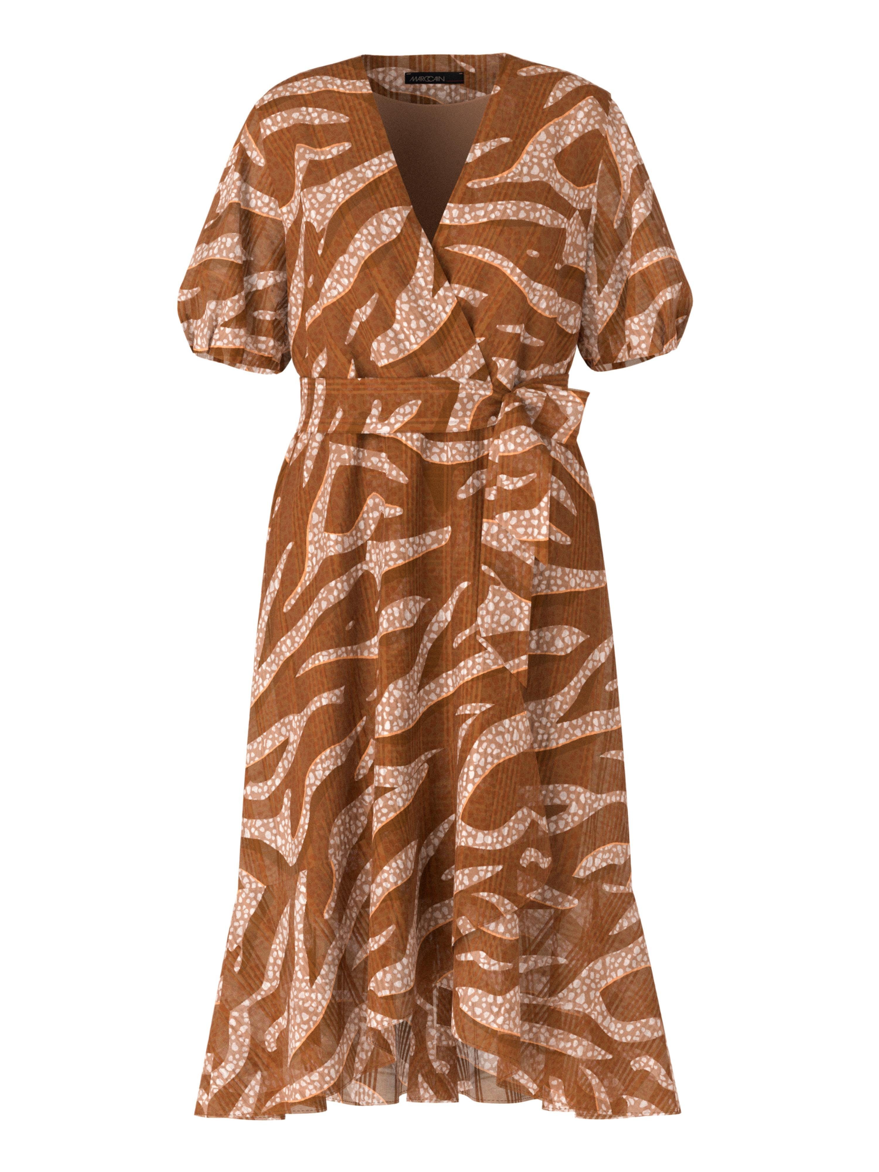 Print-Kleid in Wickel-Optik|Feminines Kleid mit taillierter Silhouette, weit schwingendem Rockteil und kurzen Volumenärmeln aus luftig-leichter Baumwoll-Seiden-Mischung mit eingewebten Streifen. Das Print-Kleid mit abstrahiertem Animalmuster präsentiert sich in Wickel-Optik mit abnehmbarem Bindegürtel. Die angesetzten Volants am Saum unterstreichen den romantischen Look. Das Modell wird mit einem nahtfeinen Reißverschluss in der Seite geschlossen und hat ein Innenfutter.|Farbe: riad|Tailliert geschnitten|Mit Innenfutter|Das Model ist 179 cm groß und trägt N3/38.|Seitlich eingenähter Reißverschluss