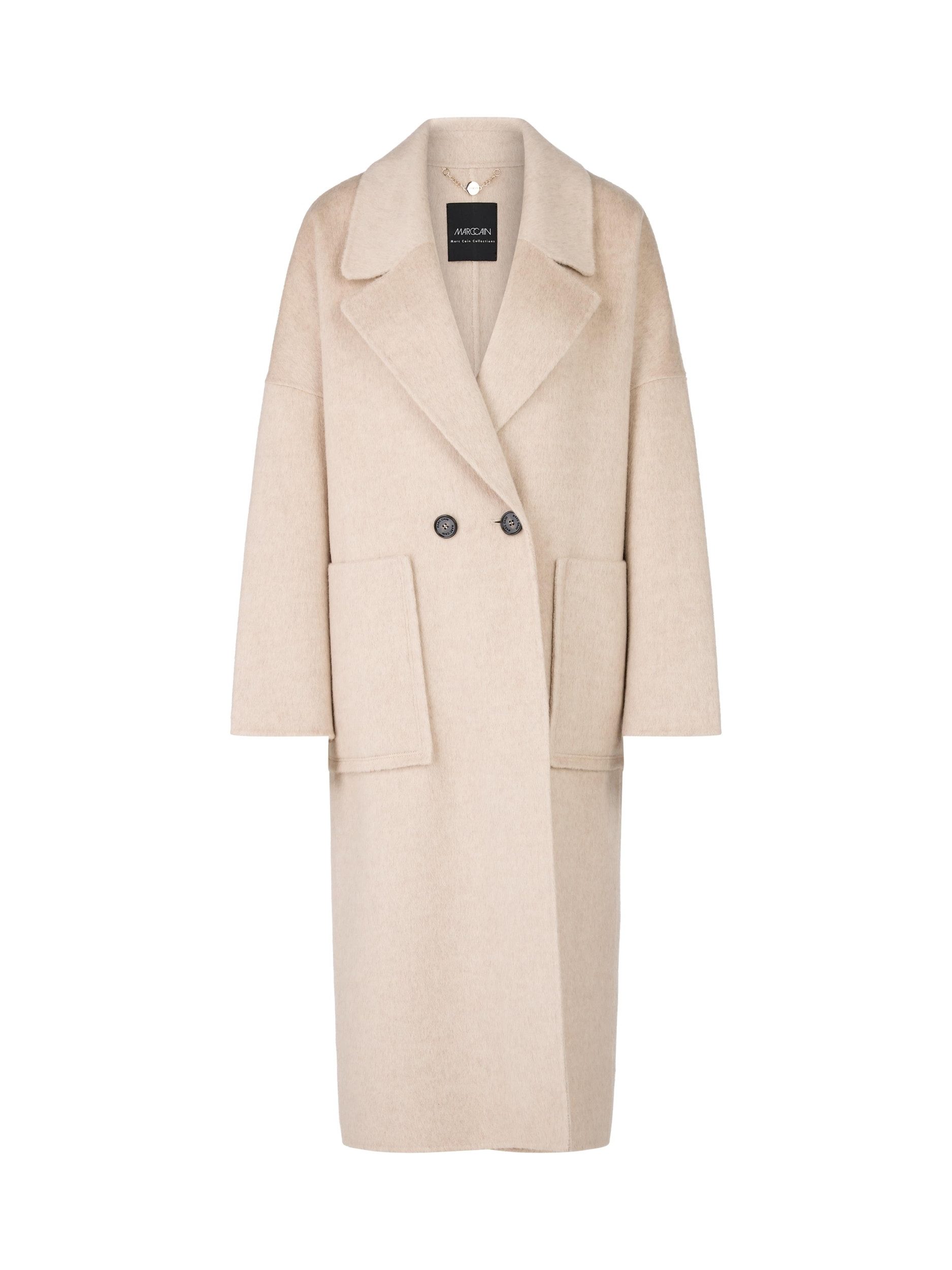 Fühl Dich königlich im luxuriösen Oversized Mantel von MARC CAINWenn die Temperaturen fallen, ist es Zeit, sich in etwas Besonderes zu hüllen. Der luxuriöse Oversized Mantel von MARC CAIN ist mehr als nur ein Kleidungsstück – er ist eine Umarmung in Form von Mode. Gefertigt aus einer exquisiten Mischung aus Wolle, Seide und Kamelwolle, bietet dieser Mantel nicht nur unvergleichliche Wärme, sondern auch eine elegante Ausstrahlung, die Deinen Look auf ein neues Level hebt.Ein Hauch von Luxus für Deinen AlltagDie Kombination aus 80% Wolle, 10% Seide und 10% Kamelwolle verleiht diesem Mantel einen weichen Griff und sorgt für ein angenehmes Tragegefühl. Der Reverskragen und die langen Ärmel schützen Dich effektiv vor der Kälte, während die weite Form des Mantels eine moderne und schmeichelhafte Silhouette kreiert. Die zwei stilvollen Knöpfe fügen eine klassische Note hinzu, die nie aus der Mode kommt.Praktisch und StilvollNicht nur die Optik überzeugt – der Mantel ist auch durchdacht praktisch. Die aufgesetzten Taschen bieten genügend Platz für Deine Essentials, die Du im Alltag benötigst. Ob beim Spaziergang durch die Stadt oder auf dem Weg ins Büro, mit diesem Mantel ziehst Du bewundernde Blicke auf Dich.Der ungefütterte Schnitt macht den Mantel leicht und vielseitig, perfekt für die Übergangszeit oder als stylische Schicht im Winter. Trage ihn offen für einen lässigen Look oder geschlossen, um Dich elegant in Szene zu setzen.Exklusive Materialmischung aus Wolle, Seide und KamelwolleWeite, schmeichelnde PassformStilvolle Details wie Reverskragen und KnöpfePraktische aufgesetzte TaschenPerfekt für jede Gelegenheit, von casual bis chicVerwandle kalte Tage in stilvolle Erlebnisse mit dem Oversized Mantel von MARC CAIN. Ein Must-Have, das in keinem Kleiderschrank fehlen sollte!