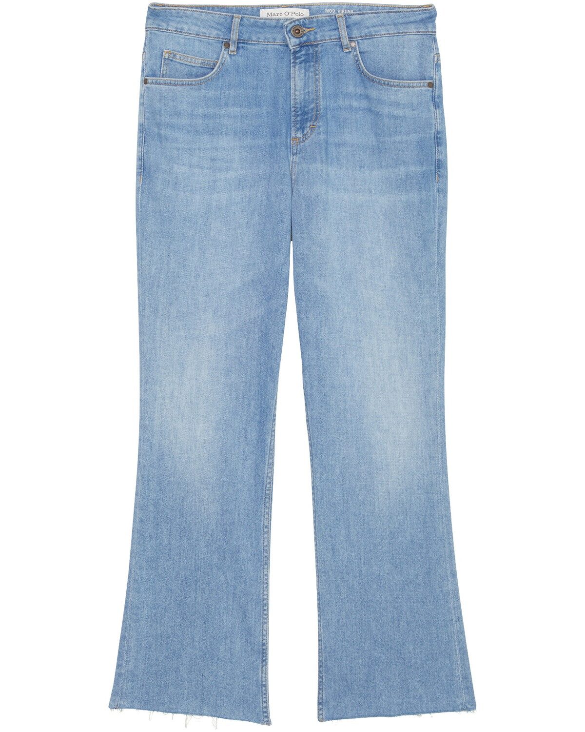Die Jeans Kiruna Flared von Marc O'Polo ist eine modische Interpretation des klassischen Denim-Styles für Damen. Gefertigt aus einem Premium-Denim-Stretch, zeichnet sich dieses Modell durch einen hohen Anteil an Elastomultiester aus, der für eine optimale Passform und dauerhafte Formstabilität sorgt. Der Materialmix aus Baumwolle und Elastan garantiert zudem eine ausgezeichnete Qualität und Langlebigkeit des Stoffs. Diese Jeans sitzt dank der hohen Leibhöhe besonders bequem und formt eine ansprechende Silhouette. Ab dem Knie verläuft das Bein leicht ausgestellt in verkürzter Длина, was den flared Look unterstreicht und gleichzeitig eine angenehme Bewegungsfreiheit bietet. Ein charakteristisches Detail ist die lässig gefranste Saumkante, die dem Design eine moderne Note verleiht. Der Five-Pocket-Style rundet das Design klassisch ab und macht die Kiruna Flared zu einem vielseitigen Begleiter – ideal zu kombinieren mit Bluse, Oversize-Blazer und derben Chunky-Boots. Oberstoff: 92% Baumwolle, 6% Elastomultiester, 2% Elastan