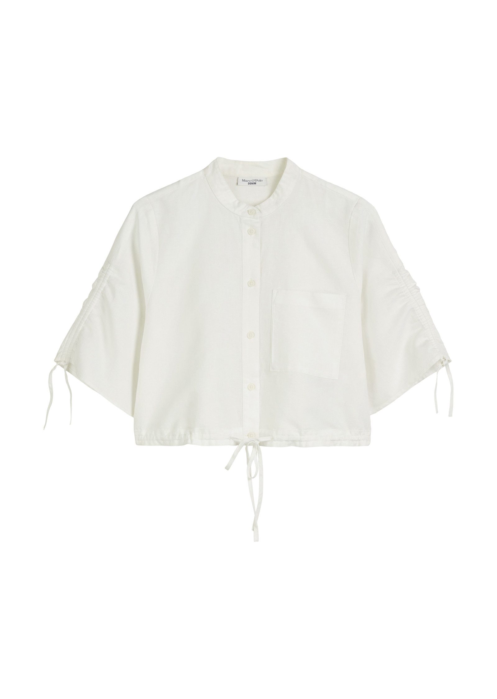 Leinen meets Baumwolle - hier treffen zwei hochwertige Naturfasern aufeinander und vereinen sich zu einer Bluse von Marc O?Polo DENIM im lässigen Statement-Style. Leinen ist die Powerfrau unter den Naturfasern - das Material nimmt Feuchtigkeit von außen auf, gibt sie schnell wieder ab und wirkt so kühlend auf der Haut. Baumwolle hingegen sorgt für Tragekomfort, Langlebigkeit und Pflegeleichtigkeit. Es gibt einige Basics, die in jeden Kleiderschrank gehören. Eine kurze Bluse gehört auf jeden Fall dazu. Unser Modell hat "zwei Gesichter" und kann sowohl für einen dezenten, minimalistischen Look als auch für einen kombinationsfreudigen, auffälligen Statement-Look getragen werden. Während sich die Bluse auf der einen Seite schlicht und klassisch mit Stehkragen, cleaner Front, kurzen Ärmeln, Knopfleiste und aufgesetzter Brusttasche präsentiert, überrascht sie auf der anderen Seite mit gerafften Tunnelzug- und Kordeldetails an Ärmeln und Saum.