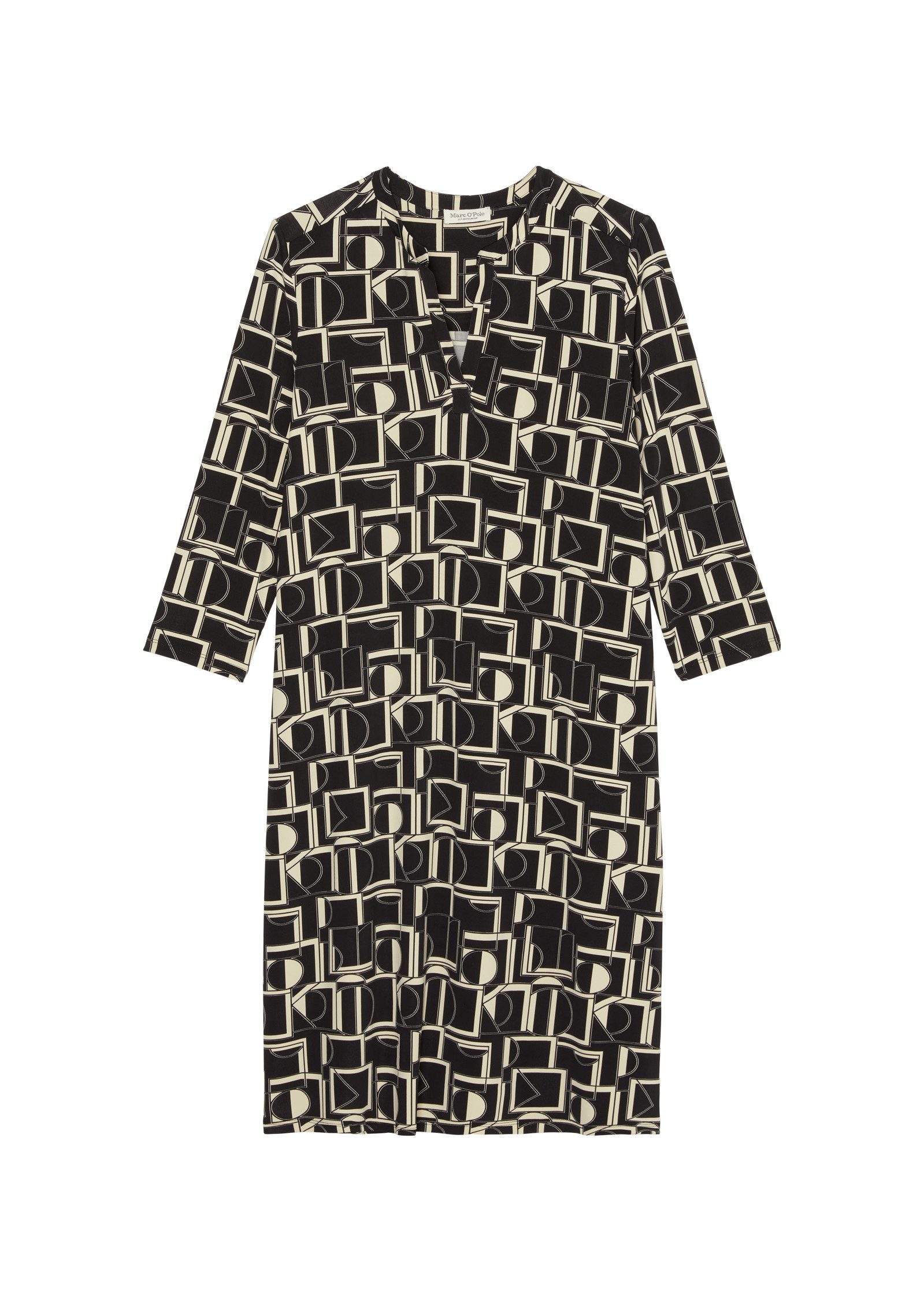 Das Jerseykleid ist ein modisches Statement für alle, die sich gerne stilvoll und bequem kleiden. Der 3/4 Arm verleiht dem Kleid einen leicht verspielten Touch und macht es perfekt für die Übergangszeit. Das Kleid ist aus einem angenehmen Materialmix gefertigt, der für höchsten Tragekomfort sorgt. Mit 95% Viskose und 5% Elasthan passt es sich perfekt an jede Figur an und schmeichelt der Silhouette.Das Design des Kleides sticht sofort ins Auge. Der Allover-Print ist modern und trendy, ohne dabei aufdringlich zu wirken. Dieses Kleid ist wie gemacht für Freizeitaktivitäten aller Art. Ob beim Stadtbummel, einem Café-Besuch oder dem Treffen mit Freunden - mit diesem Kleid machst Du immer eine gute Figur.Der V-Ausschnitt des Kleides setzt ein feminines Dekolleté gekonnt in Szene und rundet das Gesamtbild ab. Die Passform ist locker und bequem, ohne dabei die Figur zu verlieren. Das Kleid lässt sich sowohl mit flachen Schuhen als auch mit High Heels kombinieren und bietet somit zahlreiche Styling-Möglichkeiten.Das Kleid gehört zur Produktart \'Kleider\' und überzeugt durch seine hochwertige Verarbeitung und das ansprechende Design. Es ist ein Allround-Talent, das in keinem Kleiderschrank fehlen sollte. Mit diesem Kleid bist Du für jeden Anlass gut gekleidet und strahlst immer modisches Selbstbewusstsein aus. Modisches Jerseykleid mit 3/4 Arm Auffälliges Design mit Allover-Print Femininer V-Ausschnitt