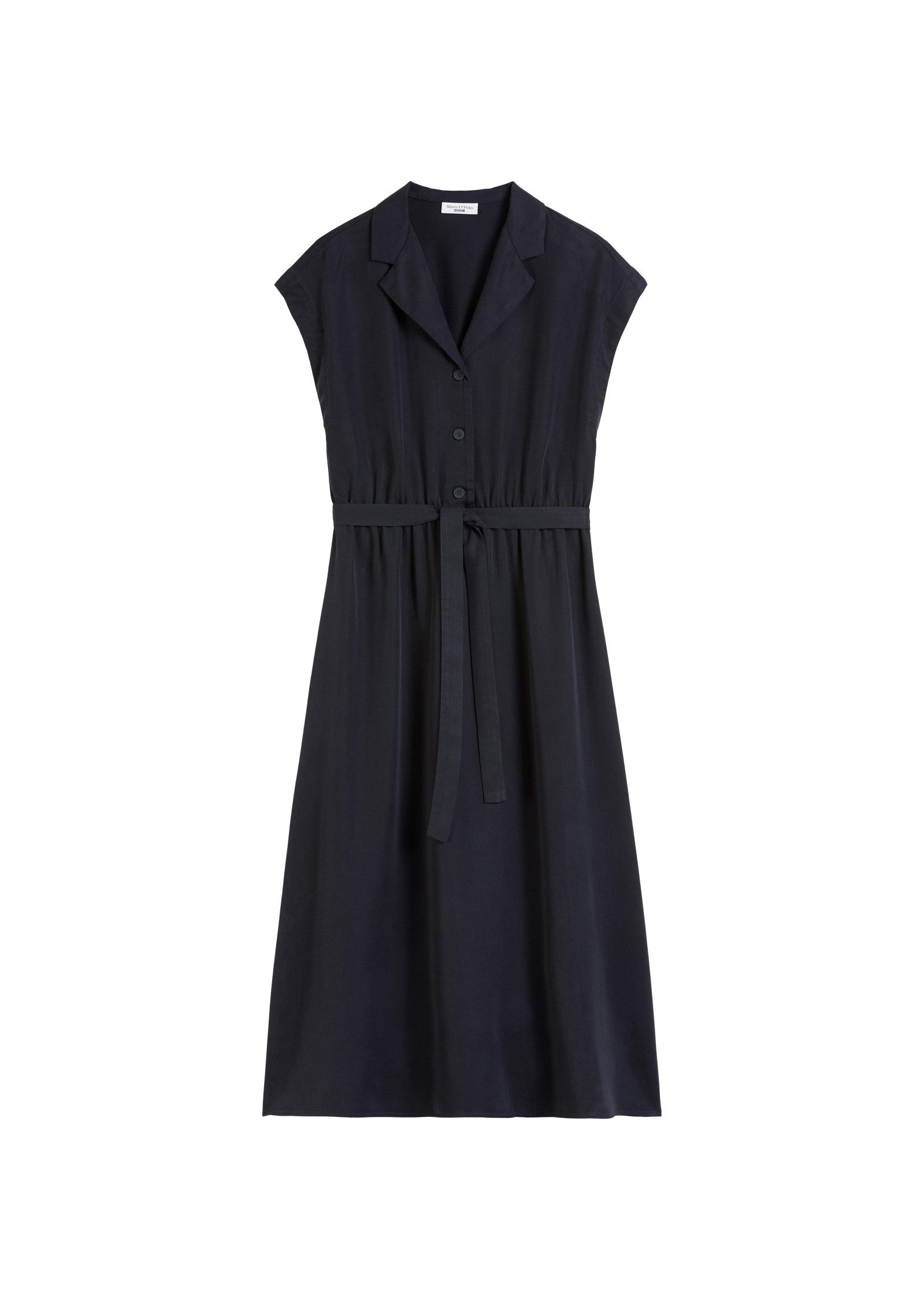 Ein Hauch von Nostalgie im modernen GewandErlebe den Charme der 50er Jahre neu interpretiert mit dem Relaxed-Fit Kleid von Marc O\'Polo DENIM. Dieses Kleid ist nicht nur ein Kleidungsstück, sondern eine Einladung, die Eleganz und den unbeschwerten Stil vergangener Tage in Deinem Alltag zu zelebrieren.Zeitlos schick mit einem TwistDas Design dieses Kleides kombiniert klassische Elemente mit modernen Akzenten. Der Reverskragen und der V-Ausschnitt verleihen eine feminine Note, während die angeschnittenen Ärmel und die durchgehende Knopfleiste bis zur elastischen Taillennaht das Kleid praktisch und bequem machen. Der abnehmbare Stoffgürtel, gehalten durch zarte Häkelschlaufen, betont Deine Taille und gibt dem Kleid eine individuelle Note.Freiheit und Komfort in jedem SchrittDer wadenlange, ausgestellte Rockteil schwingt leicht um Deine Beine und bietet optimalen Tragekomfort, egal ob beim Spaziergang durch die Stadt oder auf einer sommerlichen Gartenparty. Das Material aus 100% hochwertigem Lyocell fühlt sich weich auf der Haut an und sorgt für ein angenehmes, luftiges Tragegefühl.Perfekt für jeden AnlassOb festlich oder casual – dieses Kleid passt sich Deinem Stil an. Kombiniere es mit Sandalen für einen entspannten Look oder mit High Heels und elegantem Schmuck für festliche Anlässe. Die unifarbene Gestaltung macht es unglaublich vielseitig und leicht zu kombinieren. Stilvolles Relaxed-Fit Kleid im Retro-Look der 50er Jahre Eleganter Reverskragen und praktische Knopfleiste Angenehmes Tragegefühl dank 100% Lyocell Abnehmbarer Stoffgürtel für eine individuelle Passform Ideal für verschiedene Anlässe – von casual bis festlichLass Dich von diesem wunderschönen Kleid verzaubern und füge Deiner Garderobe ein Stück Eleganz mit einem modernen Twist hinzu!