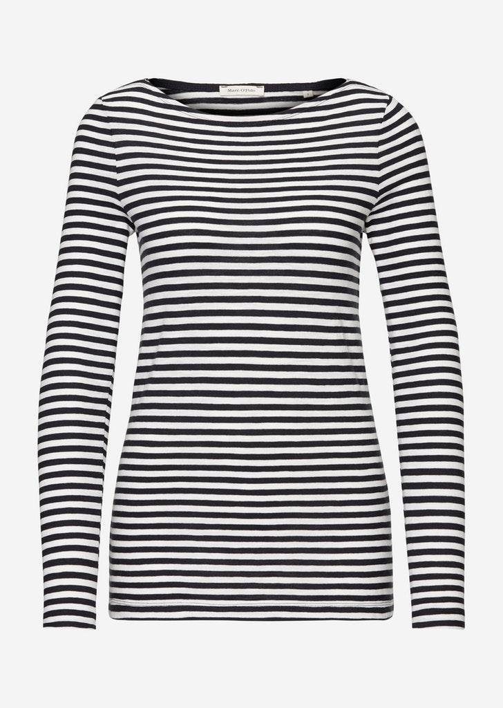 Schau dir das Langarmshirt von Marc O'Polo mal genauer an. Dieses Shirt hat einen U-Boot-Ausschnitt, der deine Schultern breiter und deinen Busen voller wirken lässt.