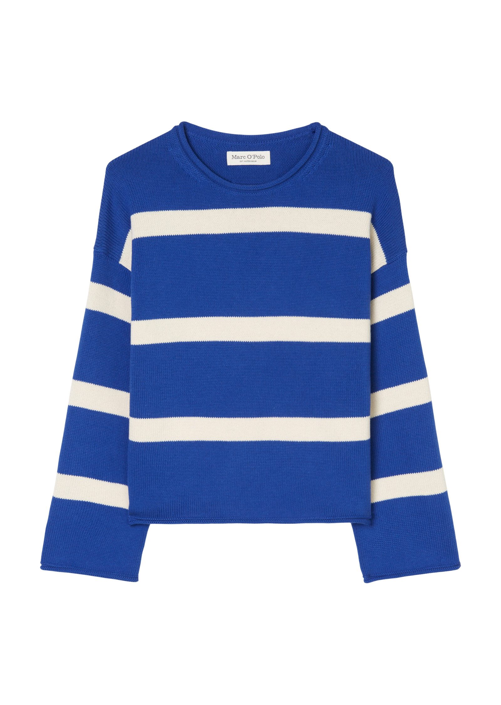 Designed for Circularity. Wir haben einen neuen Lieblingstrend bei Strickpullovern: das gestreifte, leicht verkürzte Oversize-Modell. Der Pullover ist aus reinem Bio-Baumwollgarn in klassisch glattem Muster gestrickt und sieht mit überschnittenen Schultern und langen, geraden Ärmeln super lässig aus. Eyecatcher-Details neben den markanten Streifen und den gerollten Kanten: die aufwendige Fully-fashion-Verarbeitung an den Ärmeln und die französische Schulter - hier liegt die Schulternaht nicht am höchsten Punkt, sondern ist lässig nach hinten versetzt. Perfektes Alltags-Outfit: mit High-Waist-Jeans und den Lieblings-Sneakern kombinieren.