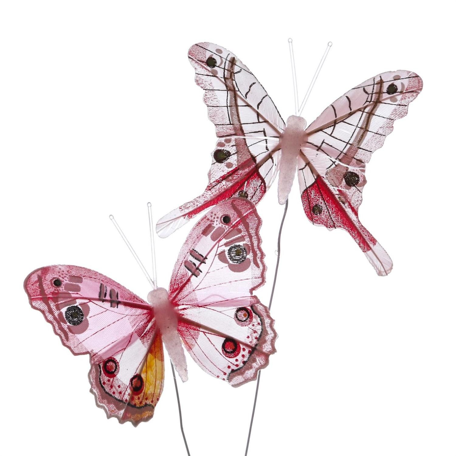 Die rosafarbenen Deko Schmetterlinge mit zwei unterschiedlichen Motiven aus Federn und Draht sind die perfekte Dekoration für den Frühling.