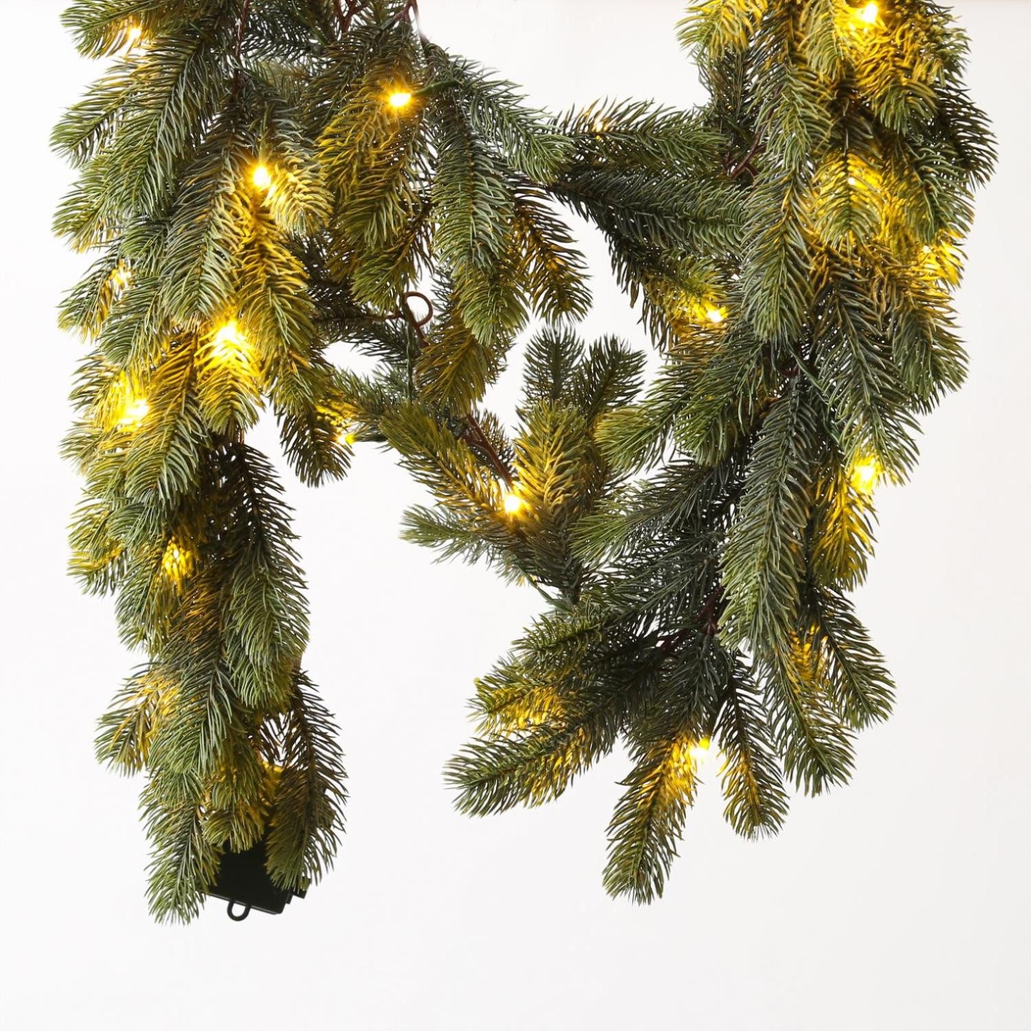 Diese wunderschöne grüne Tannengirlande mit den warmweißen LED zaubert eine weihnachtliche Stimmung in Dein Zuhause.