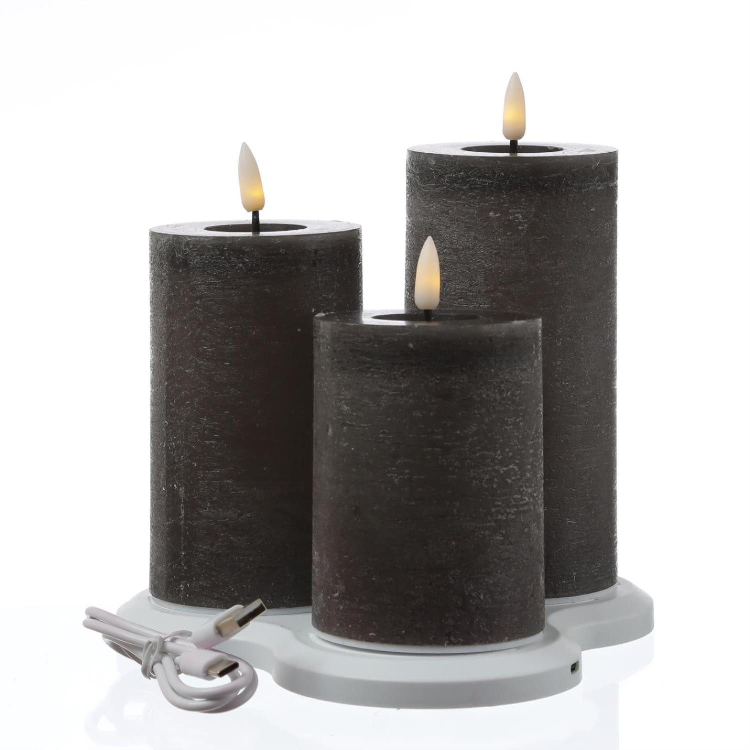 Dieses 3er Set LED Kerzen ist besonders praktisch, da es direkt mit einer Ladeschale geliefert wird. Die eingebauten Batterien lassen sich so einfach wieder nachladen.