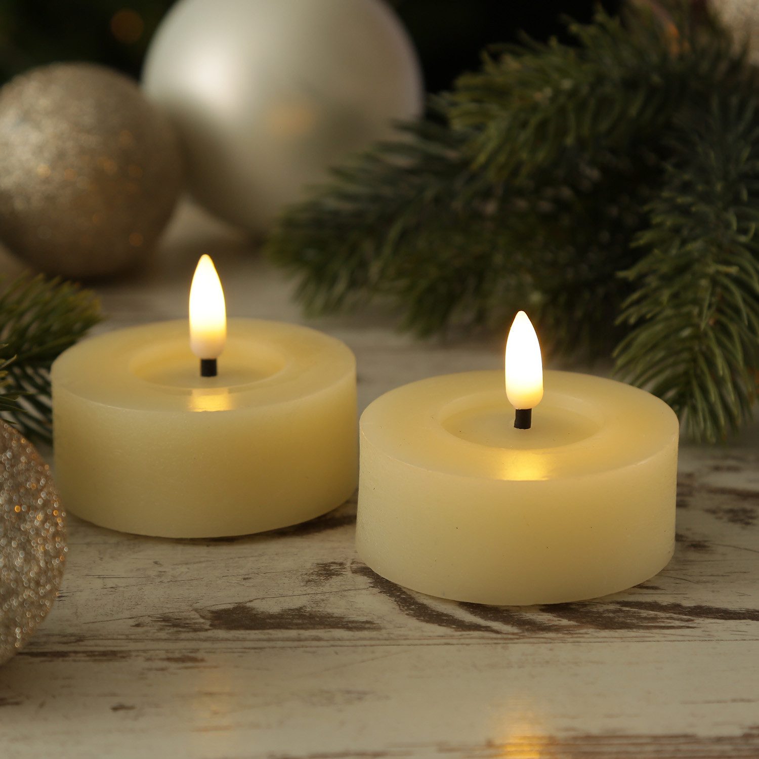 Die Flamme dieser LED Maxi Teelichter ist eine sogenannte 3D Flamme. Sie hat die Form einer echten Flamme und flackert leicht in einem warmweißen Licht. So sieht der Effekt besonders realistisch aus. Die Flamme ist in einem schön geformten Wachstrichter eingelassen. Das ähnelt einem echten Teelicht, bei dem das Wachs schon etwas geschmolzen ist.Dieses 2er Set Teelichter ist aus Echtwachs und perfekt geeignet, um die ganze Wohnung mit kleinen flackernden Lämpchen zu dekorieren.