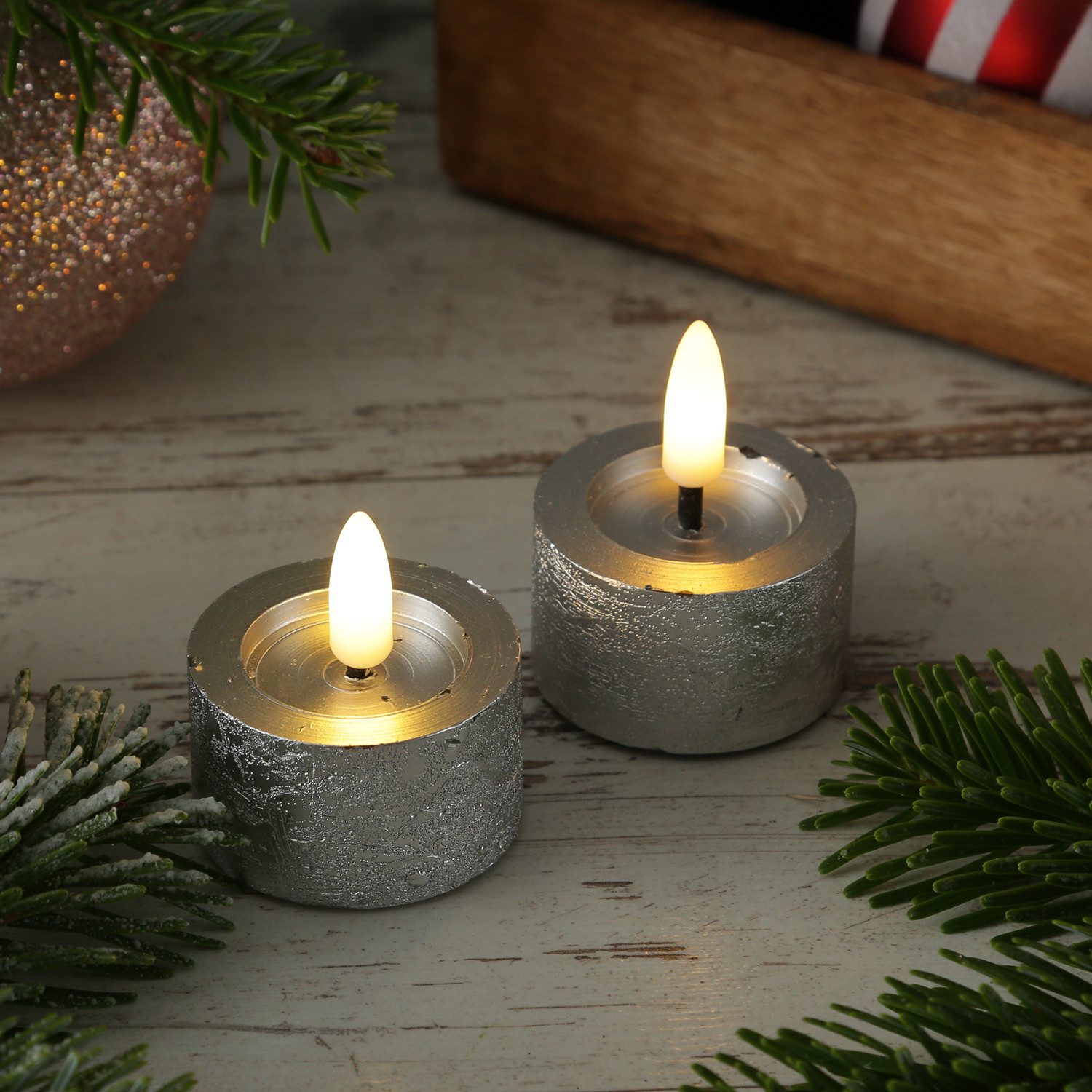 Die Flamme dieser LED Teelichter ist eine sogenannte 3D Flamme. Sie hat die Form einer echten Flamme und flackert leicht in einem warmweißen Licht. So sieht der Effekt besonders realistisch aus. Die Flamme ist in einem schön geformten Wachstrichter eingelassen. Das ähnelt einem echten Teelicht, bei dem das Wachs schon etwas geschmolzen ist.Dieses 2er Set Teelichter ist aus Echtwachs und perfekt geeignet, um die ganze Wohnung mit kleinen flackernden Lämpchen zu dekorieren.