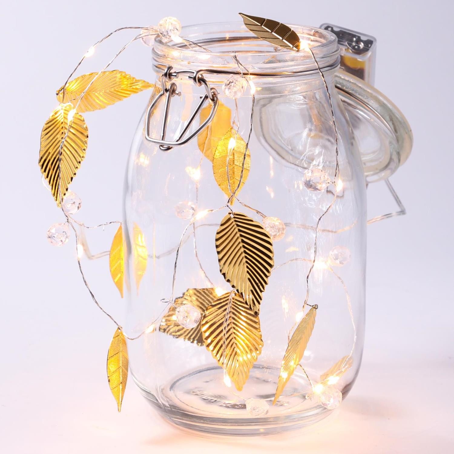 Die Lichterketten mit dem transparentem Kabel hat schimmernde Perlen und goldene Blätter aus Metall. Die LED leuchten in warmweißem Licht.