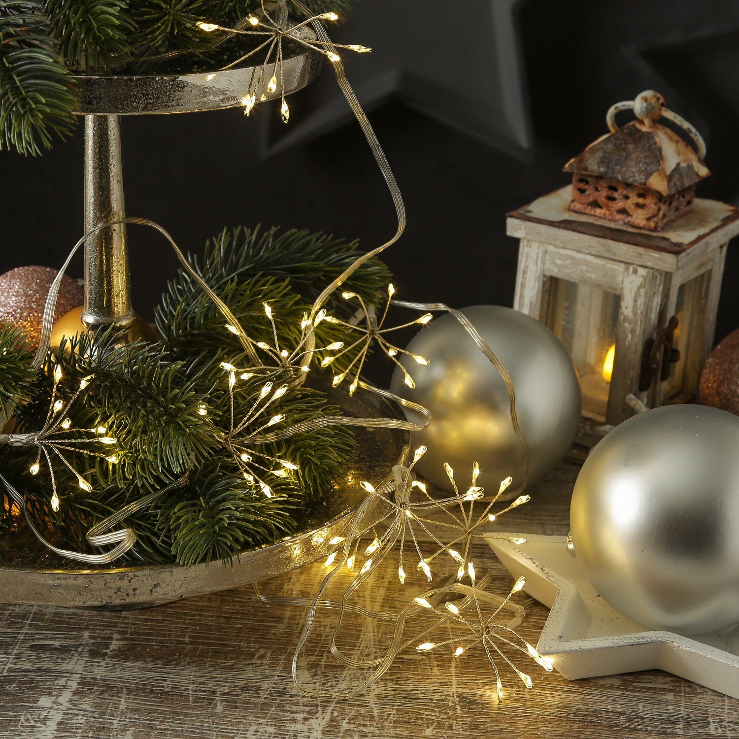 Die 9 silbernen Feuerwerk-Blüten aus biegsamem Draht strahlen einen verträumten Zauber aus und verleihen deiner Dekoration einen festlichen Touch. Ganz gleich, ob du eine Tischdeko für Hochzeiten, Feiern oder ein zauberhaftes Weihnachtsambiente gestalten möchtest ? diese Lichterkette zaubert immer ein Lächeln auf Gesichter.