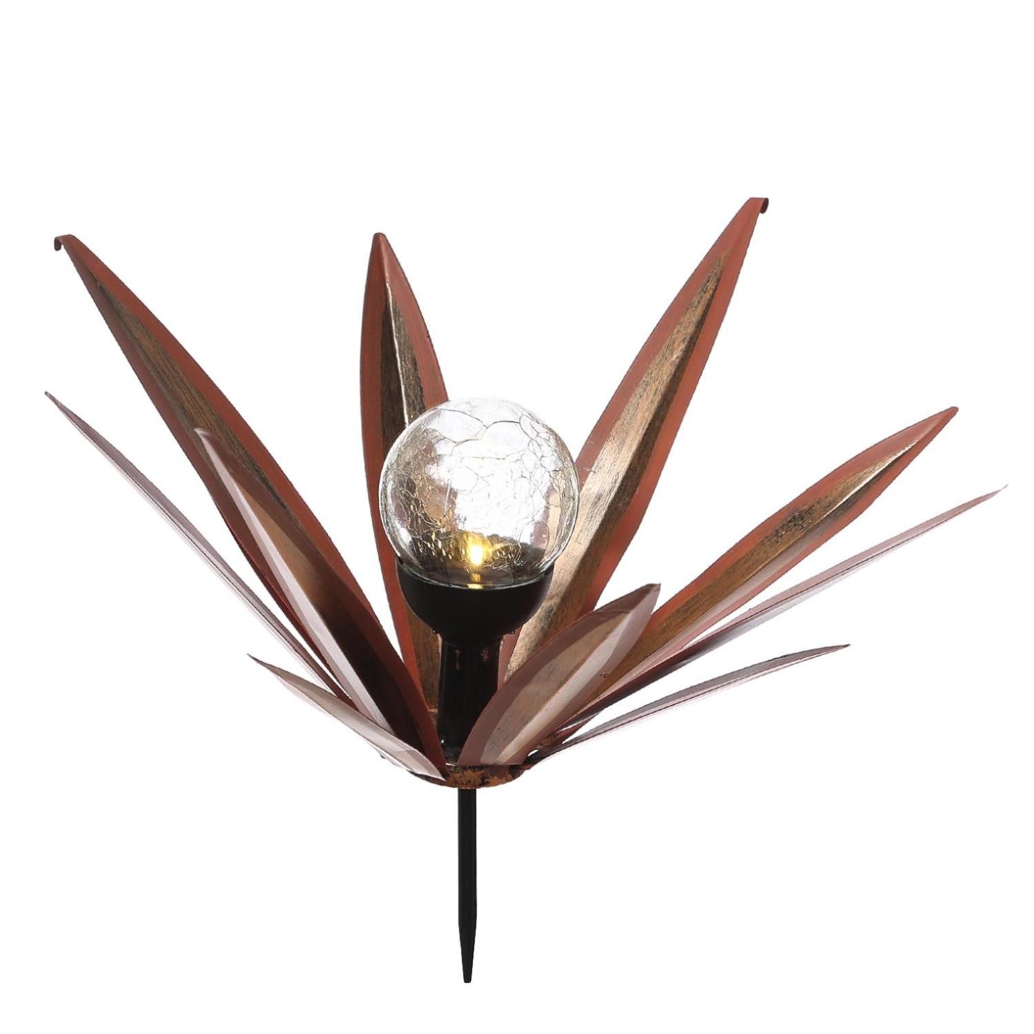 Diese dekorative Blume aus Metall wirkt sowohl bei Tag als auch bei Nacht. Die Kelchblätter sind schön farbig lackiert und schimmern im Sonnenlicht. Wenn die Dämmerung einbricht, beginnt die Glaskugel aus Bruchglas im Innern in einem schönen warmen Weiß zu leuchten.