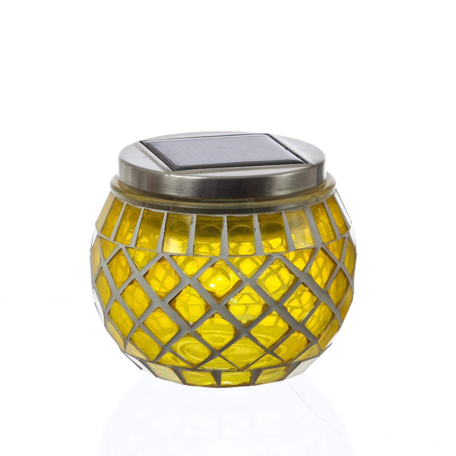 Schon bei Tageslicht ist dieses gelbe Solar Windlicht in Mosaikoptik ein echter Hingucker: die glänzenden Glassteinchen schimmern im Sonnenlicht und setzen dekorative Akzente auf Terrasse, Balkon oder im Garten. Mit Einbruch der Dunkelheit beginnt es dann zu leuchten - das kaltweiße LED-Licht bricht sich in den Mosaiksteinchen und zaubert dabei wunderschöne Schattenmuster für eine stimmungsvolle Atmosphäre.
