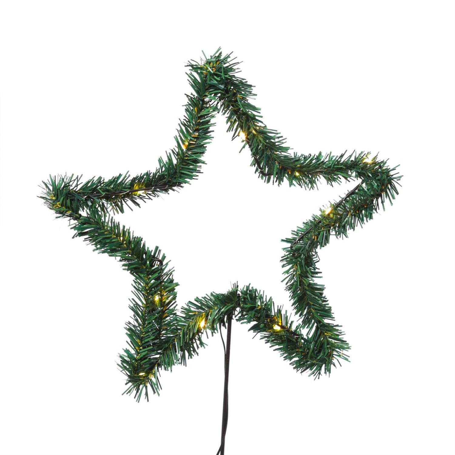 Dieser dekorative Gartenstecker ist perfekt für den Vorgarten, an der Eingangstüre oder auf der Terrasse. Der 70cm hohe Spieß aus Metall hat einen Stern aufgesetzt, um den eine grüne Tannengirlande gewicket ist. Darin leuchten 15 warmweiße LED und erzeugen so eine weihnachtliche Stimmung.