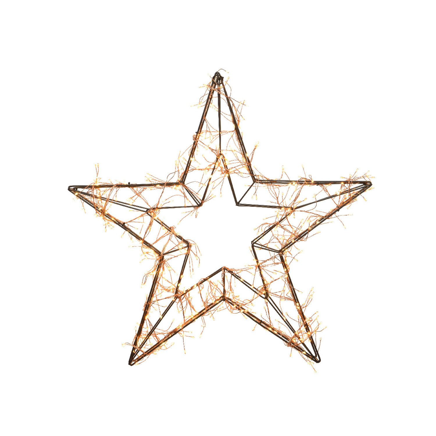 Genial sind die jeweils 150 warmweißen und 150 bernsteinfarbenen LED an der kupferfarbenen Drahtlichterkette. Diese lassen den schwarze LED Metallstern strahlen!
