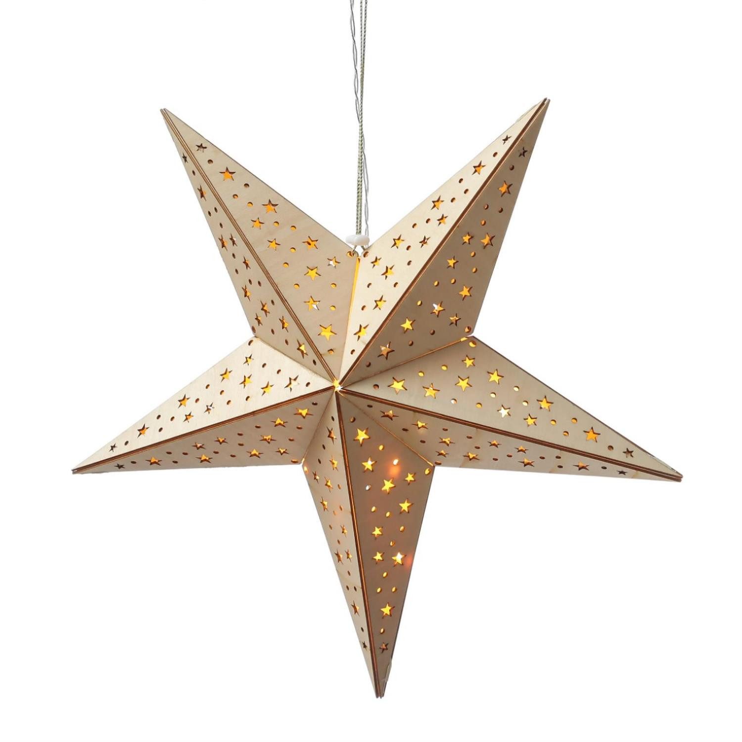 Ein fantastischer, aus Holz gefertigter Weihnachtsstern, der außergewöhnlich schön aus sieht. Durch das filigrane Loch-Muster mit Sternenmotiv leuchten die 10 warmweißen LED besonders schön und sorgen für eine tolle Atmosphäre.