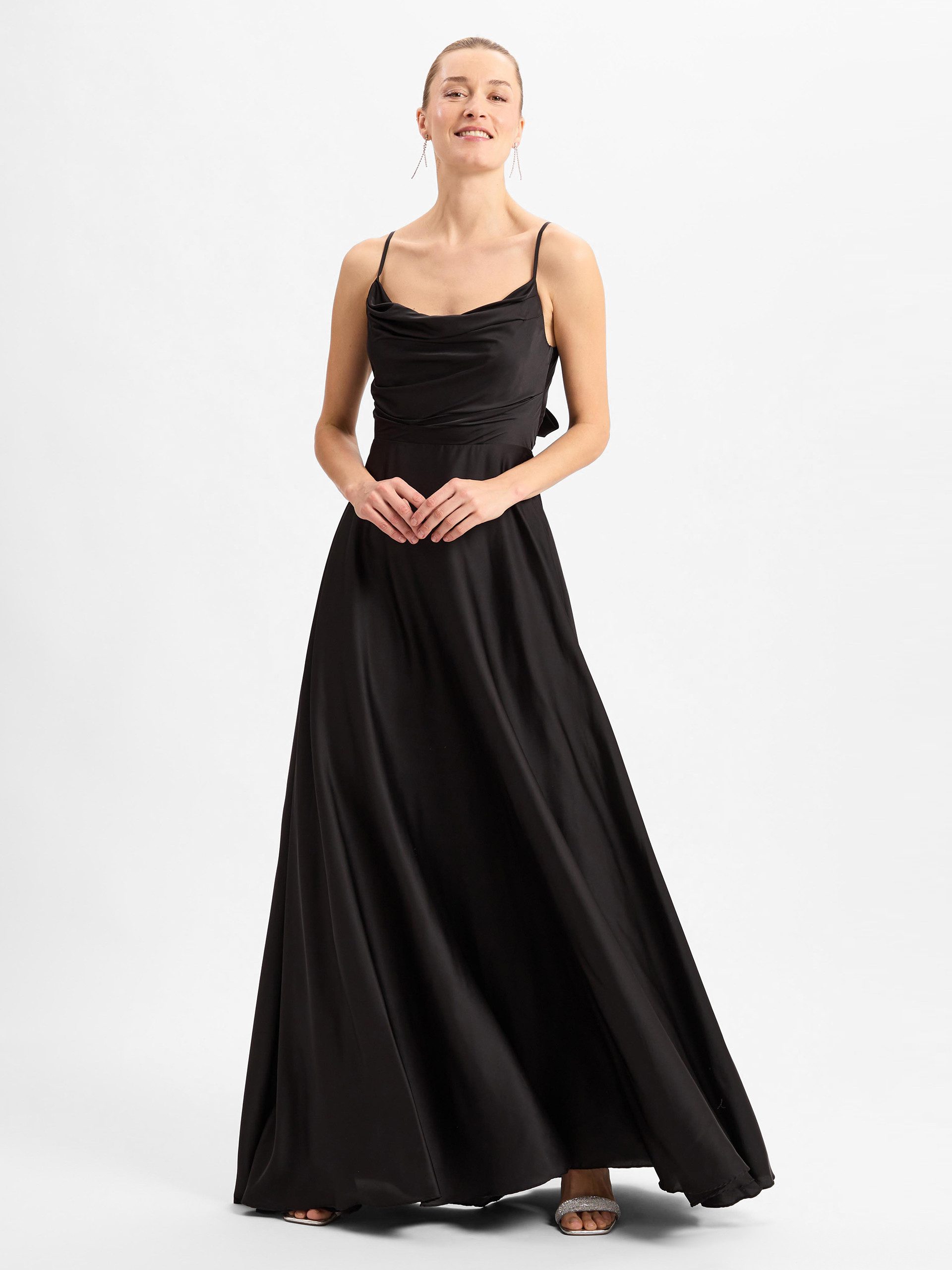 Die fließende Satin-Qualität und der Wasserfallausschnitt machen das lange Abendkleid von Marie Lund zum Highlight-Piece für den großen Auftritt.