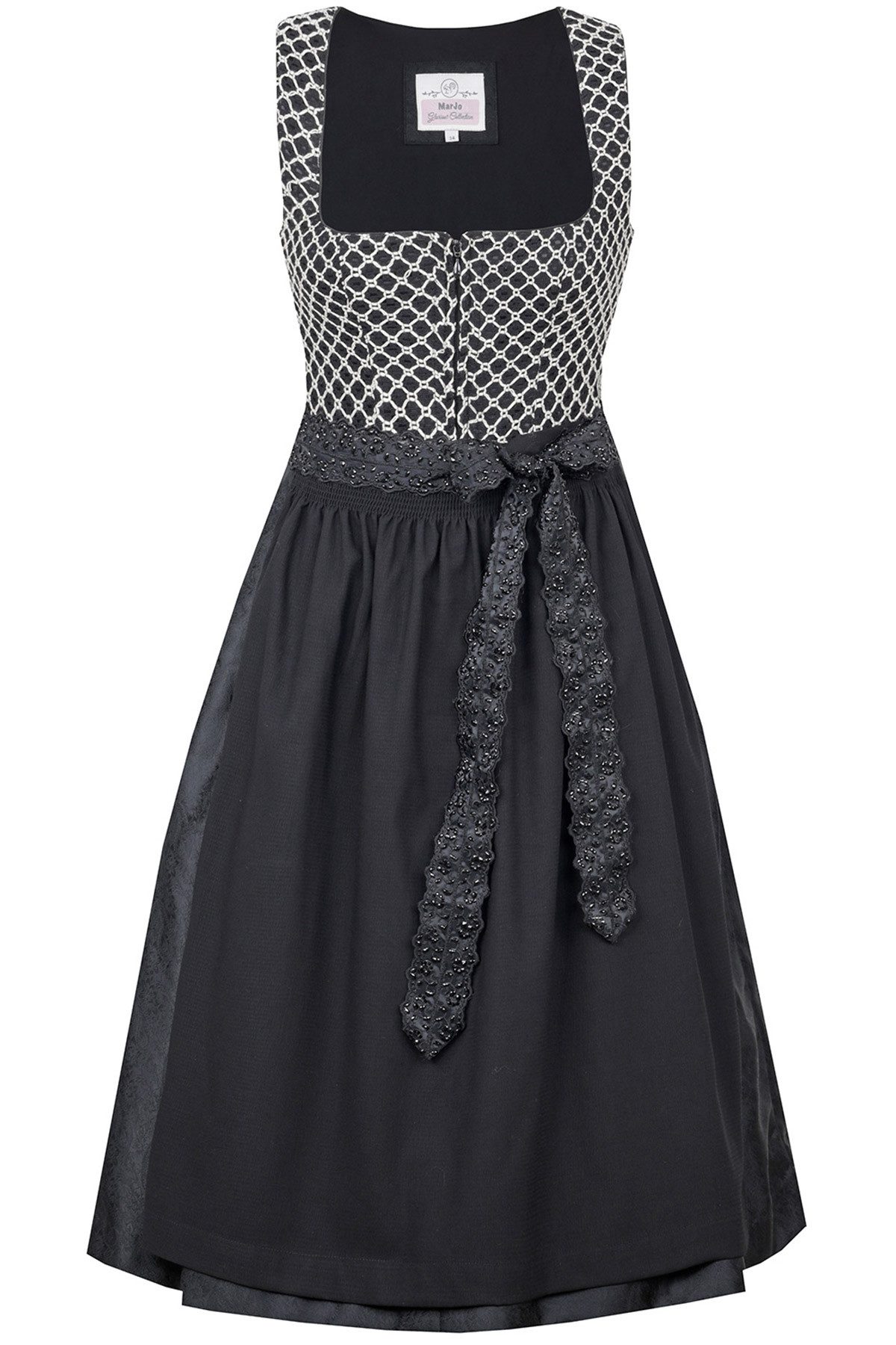 Das MarJo Dirndl „Ensdorf“ ist eine stilvolle Hommage an klassische Trachtenmode mit einem Hauch moderner Eleganz. In zeitlosem Schwarz gehalten, überzeugt dieses Modell durch sein geschmackvolles Design und seine feinen Details. Das Mieder zeigt sich mit einem dezenten Muster, das dem Oberteil Tiefe und Struktur verleiht, während der eckige Ausschnitt eine feminine und gleichzeitig selbstbewusste Silhouette formt. Die liebevoll gestalteten Knöpfe auf der Vorderseite unterstreichen die hochwertige Verarbeitung und setzen nostalgische Akzente. Ein besonderes Highlight ist die detailverliebte Schürze mit floraler Bestickung in glänzender Optik, die dem Gesamtlook eine festliche, fast schon luxuriöse Note verleiht. Abgerundet wird das Erscheinungsbild durch ein Schürzenband mit feiner Spitzenverzierung, das charmant zur Schleife gebunden wird und für einen romantischen Hingucker sorgt. Mit einer Rocklänge von 65 cm endet das Dirndl auf knieumspielender Höhe und bietet damit die perfekte Balance zwischen klassisch und modern. Ob beim Oktoberfest, auf Volksfesten, bei Hochzeiten oder anderen festlichen Anlässen – das Dirndl „Ensdorf“ sorgt stets für einen stilvollen Auftritt. Die sorgfältig ausgewählten Materialien garantieren nicht nur einen eleganten Fall, sondern auch ein angenehmes Tragegefühl den ganzen Tag über. Ein Must-have für Trachtenliebhaberinnen mit Sinn für Klasse und Raffinesse.