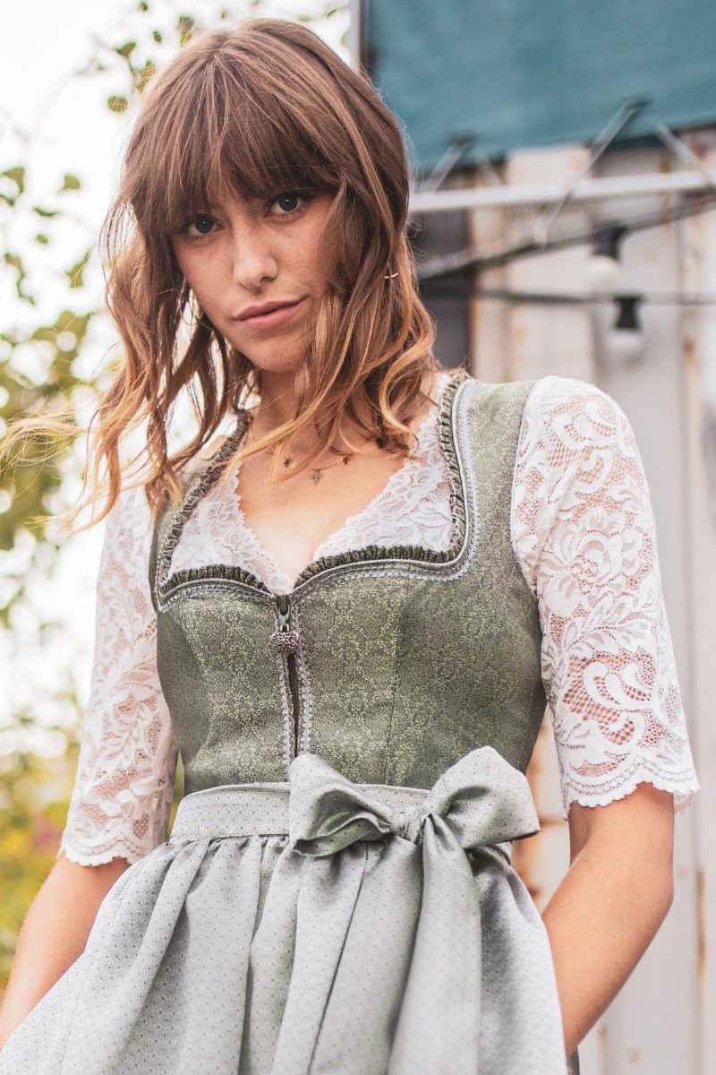 Dieses bezaubernde, knieumspielende Midi Dirndl " Eluisa" besteht aus edel schimmerndem Jacquard und hat allover ein filigranes, florales Ornamentik-Webmuster mit goldig-glänzenden Motiven auf einem moosgrünen Untergrund. Der hübsche Herz-Ausschnitt am taillierten sowie sauber abgefütterten Mieder-Oberteil wird von einer niedlichen Raffrüsche aus Dirndl- und Schürzenstoff umspielt und von einer süßen, dezent mit Lurex in Silber veredelten Posamentenborte in Schleifchen-Optik in Hellgrau umrahmt. Die Borte geht beidseitig am verdeckten Reißverschluss vorn weiter, der beidseitig mit Miederstäbchen versehen ist und den ein schöner, altsilberner Zipper-Anhänger im Ornamentik-Design mit einer Blüte in Altsilber und Strass ziert. Zudem sind der Ausschnitt und die Armausschnitte mit Schürzenstoff abgepaspelt. Der knielange Rock ist in breite Kellerfalten gelegt, beidseitig mit Eingrifftaschen ausgestattet und über dem Rocksaum mit der hellgrauen Posamentenborte mit Lurex veredelt. Die glanzvolle, am Bund geraffte Jacquard-Schürze in Silbergrau mit dem breiten Bindeband und dem zarten Webmuster aus floral anmutenden, gestrichelten Kreisen in Moosgrün auf einem silbergrauen Untergrund gibt dem hinreißenden Trachtenkleid einen stilvollen Kontrast und macht die Kreation perfekt. Bitte beachten Sie die Größenzuschläge ab Размер 48. Im Lieferumfang sind das Dirndl und die Schürze enthalten, eine Bluse ist nicht inbegriffen.