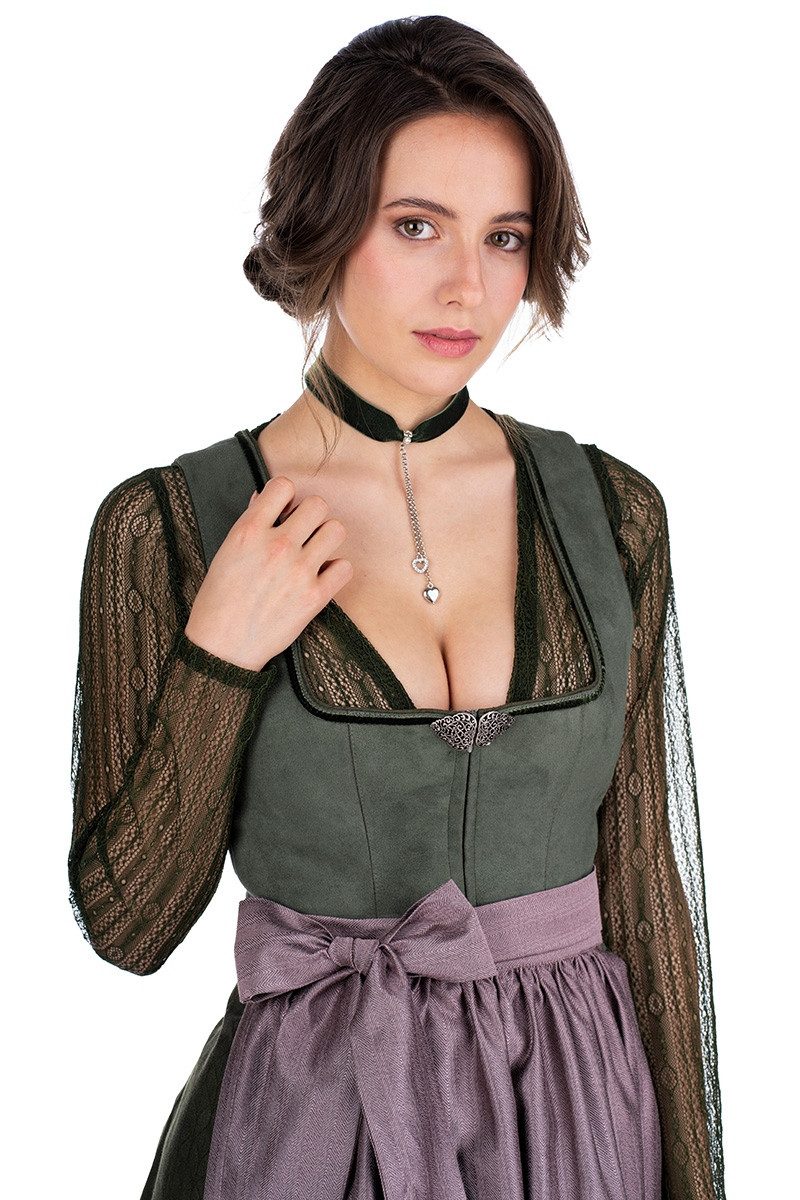 Dieses fulminante Midi Dirndl "Veronika" in Moos/Mauve Light beeindruckt durch die geschmackvolle Stoff- und Muster-Kombination aus einem veganen Leder-Mieder in dezentem Moosgrün, einem wadenlangen Jacquard-Rock und einer schimmernden Schürze im Fischgrat-Design. Das tailliert geschnittene, sauber abgefütterte Miederoberteil in Veloursleder-Art hat einen abgerundeten Balconette-Ausschnitt, der von einer Samtborte in Dunkelgrün umrahmt wird und - ebenso wie die Armausschnitte - mit Rockstoff abgepaspelt ist, einen verdeckten Reißverschluss mit beidseitig eingearbeiteten Miederstäbchen und eine hübsche Metallschließe im Ornamentik-Ajour-Design in Altsilber. Der Rock in Jacquard-Art hat ein exquisites Webmuster aus stilisierten, leicht abstrahierten Blumen-Motiven aus zarten Linien mit Blüten in Rautenform und die Blättern aus gebogenen Linien in hellerem Grün auf einem Hintergrund in warmem Moosgrün, ist in breite Kellerfalten gelegt und beidseitig mit Eingrifftaschen versehen. Die toll glänzende, am Bund geraffte Schürze in hellem Mauve mit dem Fischgrat-Webmuster, dem breiten Bindeband und dem geraden Saum rundet die Kreation ab. Im Lieferumfang ist das Dirndl und die Schürze enthalten, eine Dirndbluse ist nicht inbegriffen. Bitte beachten Sie die Größenzuschläge ab Размер 48.