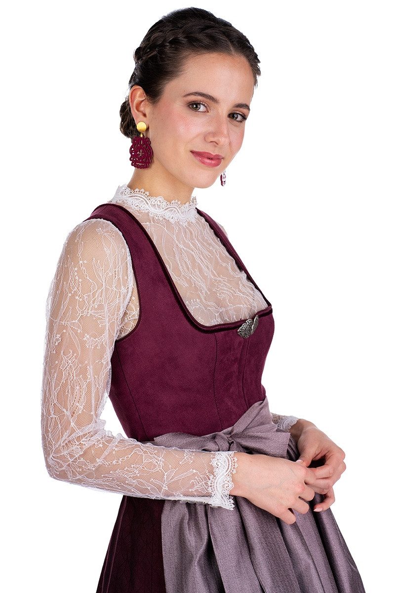 Wundervoll anzusehen ist dieses fabelhafte, kniebedeckende Midi Dirndl "Veronika" im Stoff- und Muster-Mix in Wine/Mauve Light mit dem weichen, veganem Leder-Mieder, dem edlen Jacquard-Rock und der fein schimmernden Schürze. Das taillierte, sauber abgefütterte Miederoberteil im Veloursleder-Style in Weinrot hat einen schönen Balconette-Ausschnitt, der von einer Samtborte in Bordeaux umrahmt wird. Ausschnitt und Armausschnitte sind zudem mit Rockstoff abgepaspelt. Vorn gibt es einen verdeckten Reißverschluss, der beidseitig mit Miederstäbchen versehen und oben mit einer altsilbernen Metall-Schließe im herzförmigen Ornamentik-Ajour-Design zum Einhaken geschmückt ist. Der hübsche, knapp wadenlange Rock im floralen Look mit dem raffinierten, geometisch angehauchten Webmuster aus Rauten und Viertelkreisen aus zarten Linien verfügt beidseitig über Eingrifftaschen. Die glanzvolle, am Bund geraffte Dirndlschürze in dezentem Mauve mit dem breiten Bindeband, dem geraden Saum und der feinen Webstruktur im Fischgrat-Style macht das Trachtenkleid perfekt. Im Lieferumfang ist das vegane Leder Dirndl mit der Schürze enthalten, eine Bluse ist nicht inbegriffen. Bitte beachten Sie die Größenzuschläge ab Размер 48.