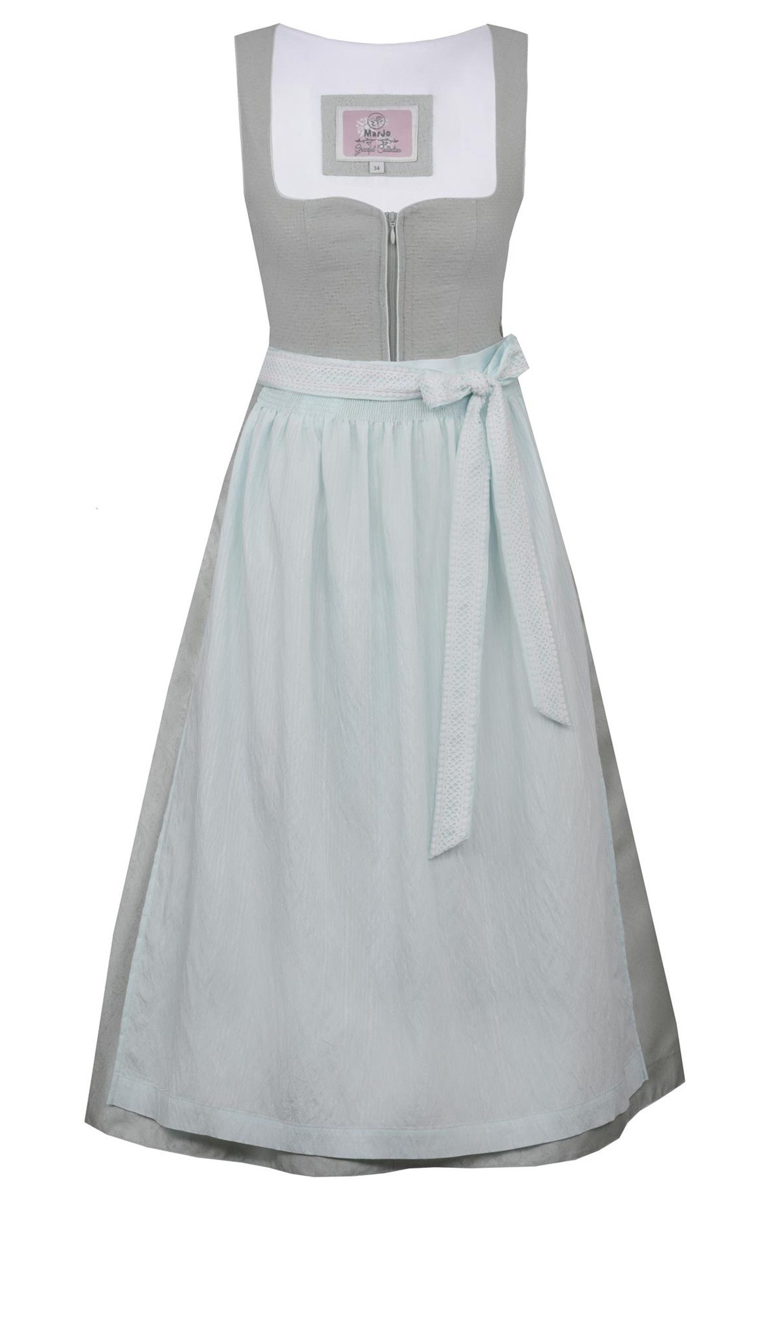 Unser wunderschönes Minidirndl Ornbau in Gletscher ist ein sehr edles Dirndl von Marjo. Das Salbeigrüne Oberteil mit Korbmuster hat einen herzförmigen Ausschnitt, der mit einer hellblauen Borte umrandet ist und Ihr Dekolleté betont. Geschlossen wird das Dirndl vorne mit einem Reißverschluss, der von einem Zipper ergänzt wird. Der schwingende glänzende Rock mit schönen Paisley-Elementen ist in Kellerfalten gelegt. An beiden Seiten befinden sich Eingriffstaschen, die mit Zipper geschlossen werden können. Die umwerfende Eisblaue Schürze hat ein dezentes Muster. Das Schürzenband hat eine Borte mit Spitzenstickerei und sorgt für eine großartige Schleife.