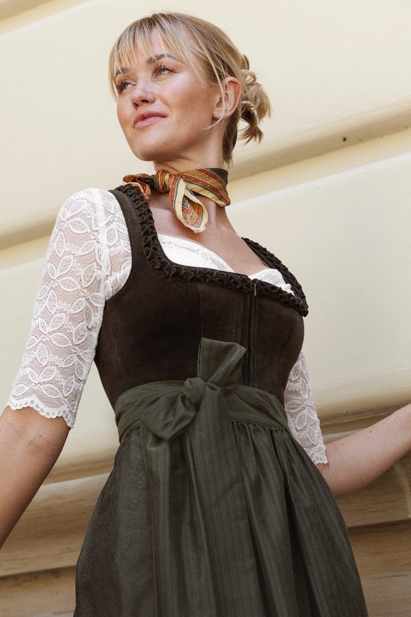 Olivgrünes Midi Dirndl Emmering mit wadenlangem Rock und tollen Akzenten