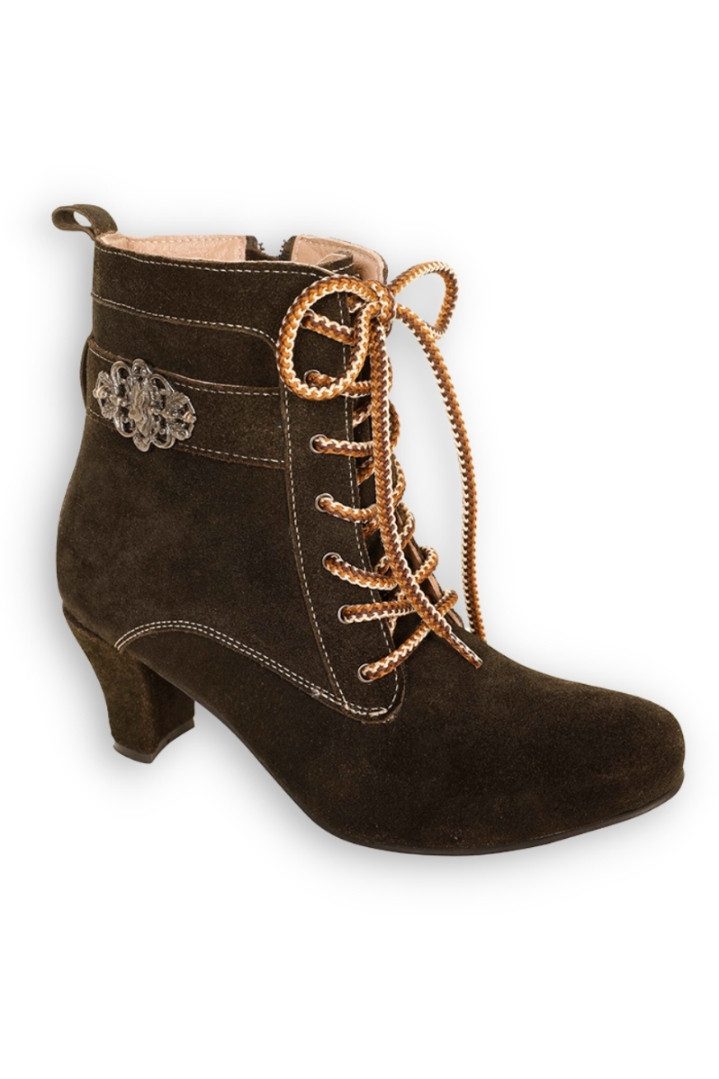 Die stilvolle Trachten Stiefelette aus feinem Leder im urigen Look steht für Eleganz auch unterwegs! Sie ist aus weichem, robustem Velourleder gefertigt und mit einer hübschen Nahtführung versehen. Der Blickfang ist eine Metallbrosche mit Hirsch- und Eichenblattmotiv an den Außenseiten. Die Stiefelette ist klassisch mit Schnürsenkeln im Wander-Stil zu schnüren und an den Innenseiten befinden sich Reißverschlüsse - somit ist man mit diesem überzeugendem Trachtenstück der Marke MarJo nicht nur flott zu Fuß, sondern gelangt auch flott in die Stiefel. Das Innenfutter hat ein zünftiges Karo-Muster und es gibt ein gepolstertes Lederfußbett. Perfekt machen den Stiefel die leicht abgerundete Schuhspitze und der elegant geschwungene Trichterabsatz.
