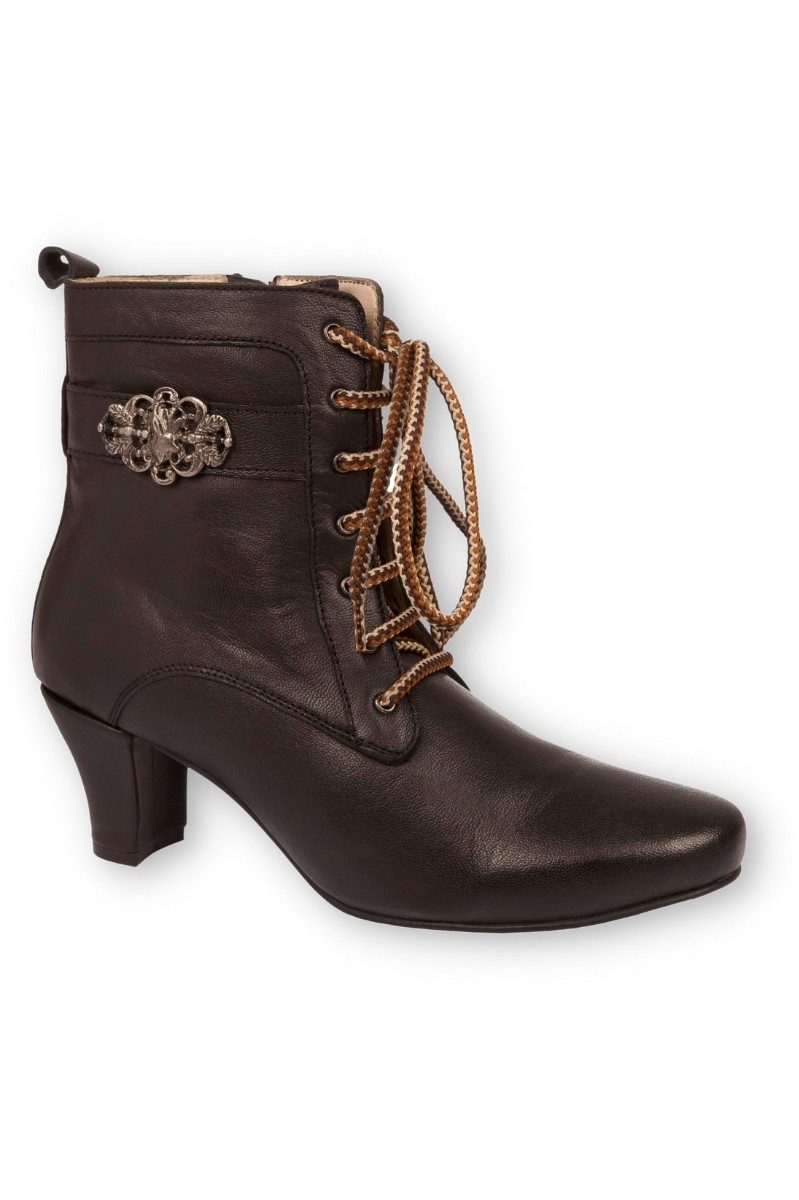 Die exquisite Damen Trachten Stiefelette Bärbel aus feinem Leder im urigen Look steht für Eleganz auch unterwegs! Sie ist aus feinem, robustem Glattleder gefertigt und mit einer hübschen Nahtführung versehen. Der Blickfang ist eine Metallbrosche mit Hirsch- und Eichenblatt-Motiv an den Außenseiten. Die Stiefelette ist klassisch mit dreifarbigen Rundsenkeln im Wander-Stil oder mit edlen Flachsenkeln aus Leder über Ösen zu schnüren und an den Innenseiten befinden sich Reißverschlüsse - somit ist man mit diesem überzeugendem Trachtenstück der Marke MarJo nicht nur flott zu Fuß, sondern gelangt auch flott in die Stiefel. Das Innenfutter hat ein zünftiges Karo-Muster und es gibt ein gepolstertes Lederfußbett. Perfekt machen den Stiefel die leicht abgerundete Schuhspitze, der elegant geschwungene Absatz und die kleine Zugschlaufe am Schaftabschluss.