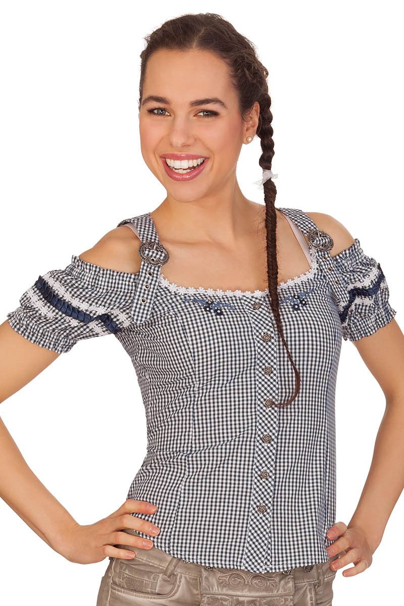 Die verführerische Carmenbluse Britt-Maren im Karo-Look ist eine liebreizende sexy Damenbluse im jungen Trachtenstil. Sie besteht aus reiner Baumwolle und bietet ein herrliches, angenehmes Tragegefühl. Der taillierte Schnitt sorgt für einen perfekten Sitz, ebenso die raffinierte Schnürung am Rückenteil. Die Träger mit ihren feschen, altsilbernen Schnallen sind individuell einstellbar. Der reizvolle Ausschnitt wird mit einer traumhaften Blumenspitze umspielt. Die entzückenden Carmenärmel sind mit wundervoller Satinrüschen- und Spitzenborte geschmückt und besitzen elastische Bündchen. Die Knopfleiste zieren schöne altsilberne Rosenknöpfe. Der Saum ist leicht gewölbt. Diese fantastische Trachtenbluse passt super zum Trachtenrock, Jeans- oder Lederhose und ist ein zauberhaftes Trachtenstück von Marjo.