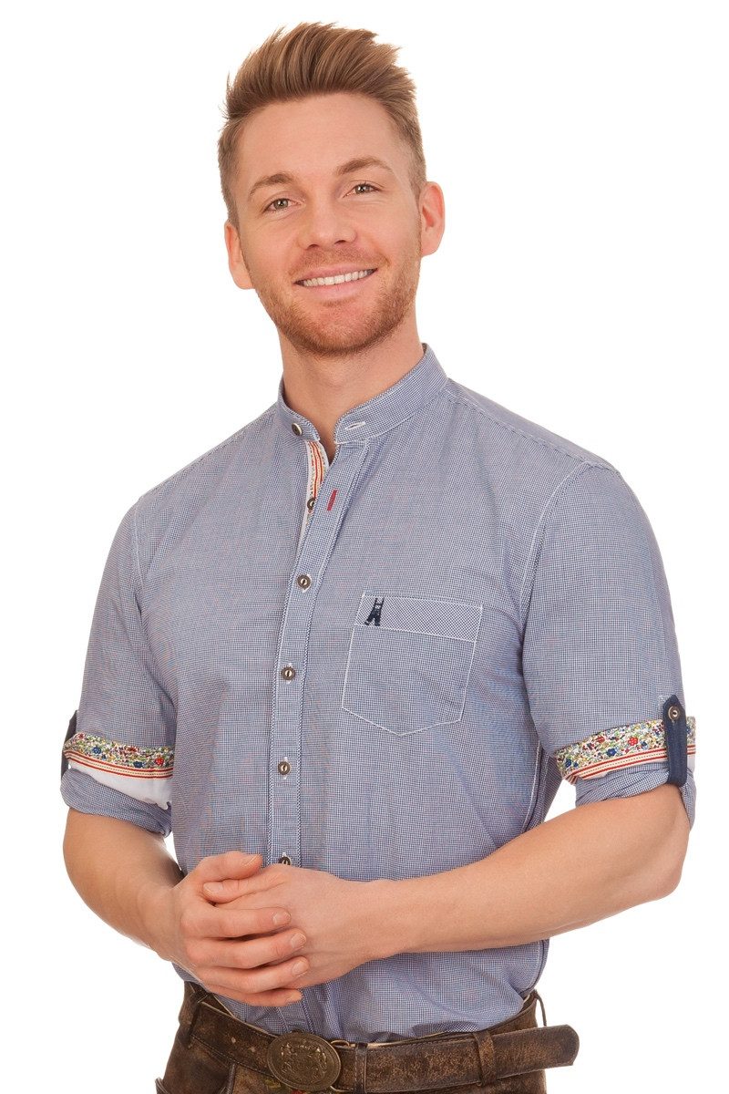 Das moderne Trachtenhemd Fait ist nicht nur ein fescher Begleiter zur Krachledernen. Es besteht aus reiner Baumwolle und bietet einen super Tragekomfort. Das fetzige Herrenhemd im Regular fit-Schnitt mit Krempelärmeln hat allover ein Mikro-Karo-Webmuster und einen traditionellen Stehkragen mit dezenter Kontrastpaspel. Die aufgesetzte Brusttasche links ist mit einer kleinen Stickerei in Form einer Lederhose mit Stegträger verziert. Die verstärkte Knopfleiste sowie die Manschetten innen sind mit einer tollen Komposition aus gewebter Streifenborte und Stoffborte mit Blumen-Print betont. Zudem haben die Manschetten an der Außenseite eine Ziernaht. Das oberste Knopfloch der Lochleiste ist mit knalligem Kontrastgarn hervorgehoben. Die Nähte sowie die Knopflöcher an den Manschetten sind ebenfalls mit Kontrastgarn veredelt. Durch einen Riegel aus Kontraststoff und einen Knopf werden die Krempelärmel befestigt. Все Knöpfe sind in rustikaler Hirschhorn-Optik gehalten. Über dem linken Ärmelschlitz gibt es kleine Stickerei, bestehend aus Hut, Sonnenbrille und Bart, und vorn links am leicht gewölbten Saum einen kleinen Markenaufnäher in Velours-Optik. Das krachig-stylische Herren Hemd kommt aus dem Hause MarJo.