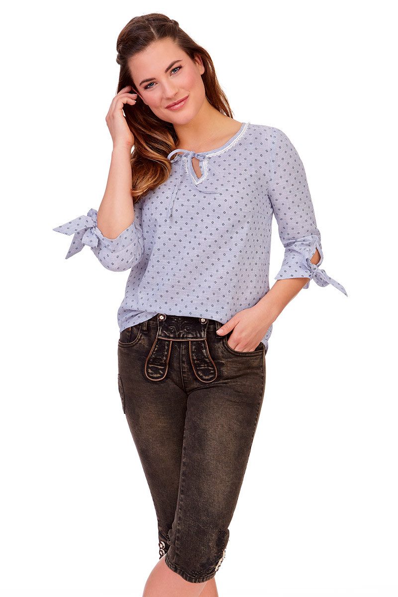 Die stylische Trachtenjeans Milla in Kniebund-Длина mit keckem Trachtenlatz, eine coole Kreation by MarJo, kann sich als fescher Lederhosen-Ersatz absolut sehen lassen und passt super zu Trachtenbluse, Trachtenshirt und Mieder. Durch den hohen Baumwoll- und den leichten Stretch-Anteil sowie den taillierten Schnitt ergibt sich eine angenehme Stoffqualität und ein toller Tragekomfort. Der typische Five-Pocket-Style mit zwei Eingrifftaschen vorn, einer Uhrentasche rechts und den beiden aufgesetzten Gesäßtaschen wird durch eine raffinierte, kleine Tasche mit dreieckiger Ziernaht an der linken Eingrifftasche und einer Messertasche rechts ergänzt. Die Uhrentasche ist mit einer Borte in Leder-Optik geschmückt, auch den schicken Trachtenlatz zieren urige Paspeln im Leder-Stil. Der Latz kann durch die Knöpfe beidseitig geöffnet werden, darunter befindet sich eine klassische Knopfleiste als Verschluss. Was an keiner Trachtenjeans fehlen darf, sind die trachtigen Stickereien und gestickten Zierlinien, die auf und um den Latz, unten an den Beinen und auf der Messertasche zu finden sind. Die märchenhaften, floralen Stickereien sind in edlem Schwarz gehalten und ergeben durch den stylischen Used-Look des Jeans-Materials einen feinen Kontrast. Der Beinabschluss wird seitlich geknöpft. Все sichtbaren Knöpfe sind tierischen Ursprungs und haben eine kernige Hirschhorn-Optik. Besondere Details dieser modischen Kniebund-Jeans sind zudem die kleine Hirschkopf-Stickerei auf der rechten Tasche hinten und die Gürtelschlaufen am Bund. Bitte beachten Sie den Übergrößenzuschlag ab Размер 48.