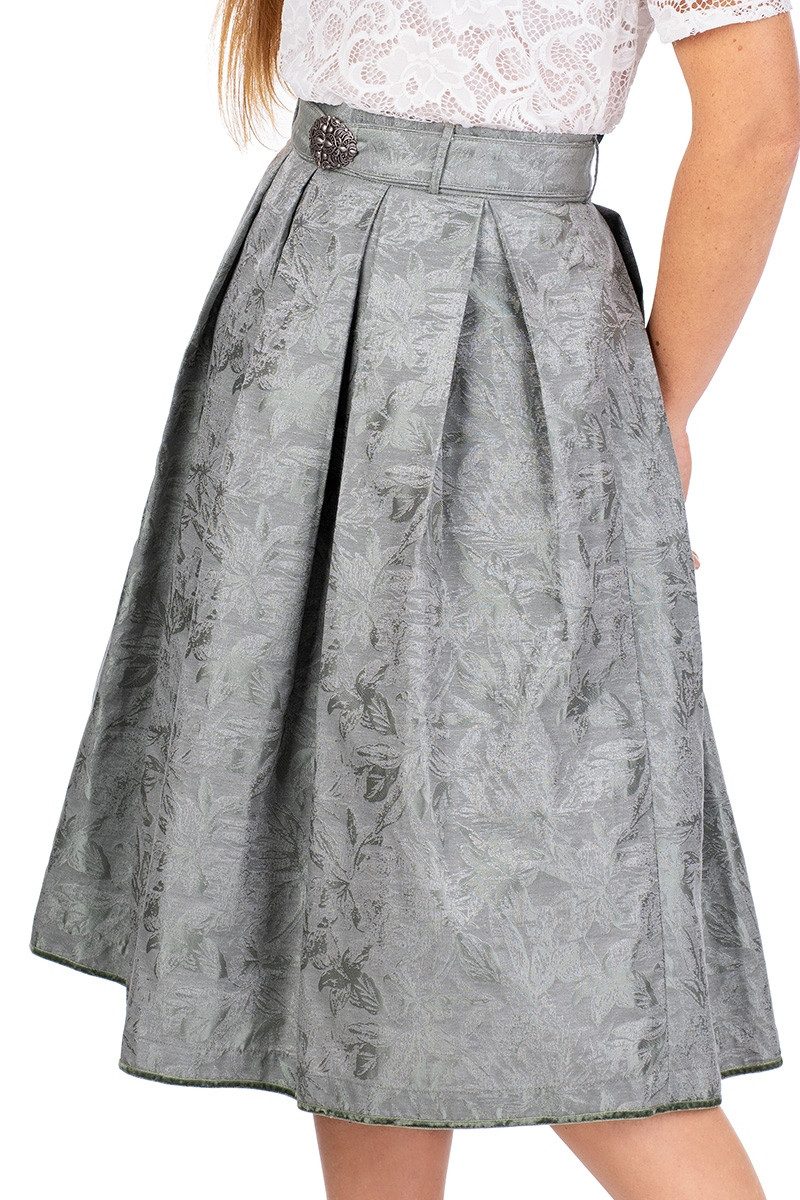 Dieser traumhafte, wadenlange Damen Trachtenrock "Marquartstein" in der Farbe Jade wird aus edel schimmerndem Jacquardstoff gefertigt und hat ein prachtvolles Webmuster aus großen Blumen mit feinen Schattierungen. Der verstärkte Bund ist mit schmalen Gürtelschlaufen versehen und mittig hinten gibt es einen verdeckten Reißverschluss. Die ausgestellte A-Linie des Rockteils wird durch stilvolle, breite Kellerfalten betont. Am Rockabschluss setzt eine farblich passende Samtborte einen harmonischen Akzent. Der cremefarbene Unterrock in Taft-Art bietet ein angenehmes Tragegefühl. Abgerundet wird das Design durch einen hinreißenden Stoffgürtel mit einer hübsche Metallschließe im Ornamentik-Design mit Ajour-Akzenten in Altsilber zum Einhaken. Dieser Rock ist die perfekte Ergänzung zu einem Blusenbody, einer Trachtenbluse oder einem Spitzenshirt.