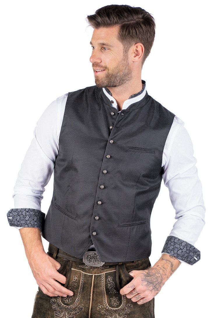 Ein echter Hingucker in edler Asphalt-Farbe! Diese festliche Herren-Trachtenweste aus fein glänzendem Jacquard begeistert mit einem zarten Gitter-Webmuster und eleganten Details. Der verstärkte Stehkragen und die Knopf- sowie Knopflochleiste sind mit feiner Paspel aus Rückenstoff veredelt. Altsilberne Ösenknöpfe mit floralem Ornamentik-Motiv setzen stilvolle Akzente. Praktische Brust- und Eingriffstaschen, jeweils mit doppelter Paspel, bieten Platz für kleine Utensilien. Die Rückseite aus Kontraststoff mit Minimal-Webmuster und ein verstellbarer Rückenriegel mit mattsilberner Schnalle sorgen für perfekten Sitz. Ein angenehm leicht glänzendes Taftfutter und eine zusätzliche Innentasche runden das Design ab – ideal zur Lederhose oder für stilvolle Trachten-Outfits. Bitte Größenzuschläge ab Размер 58 beachten.