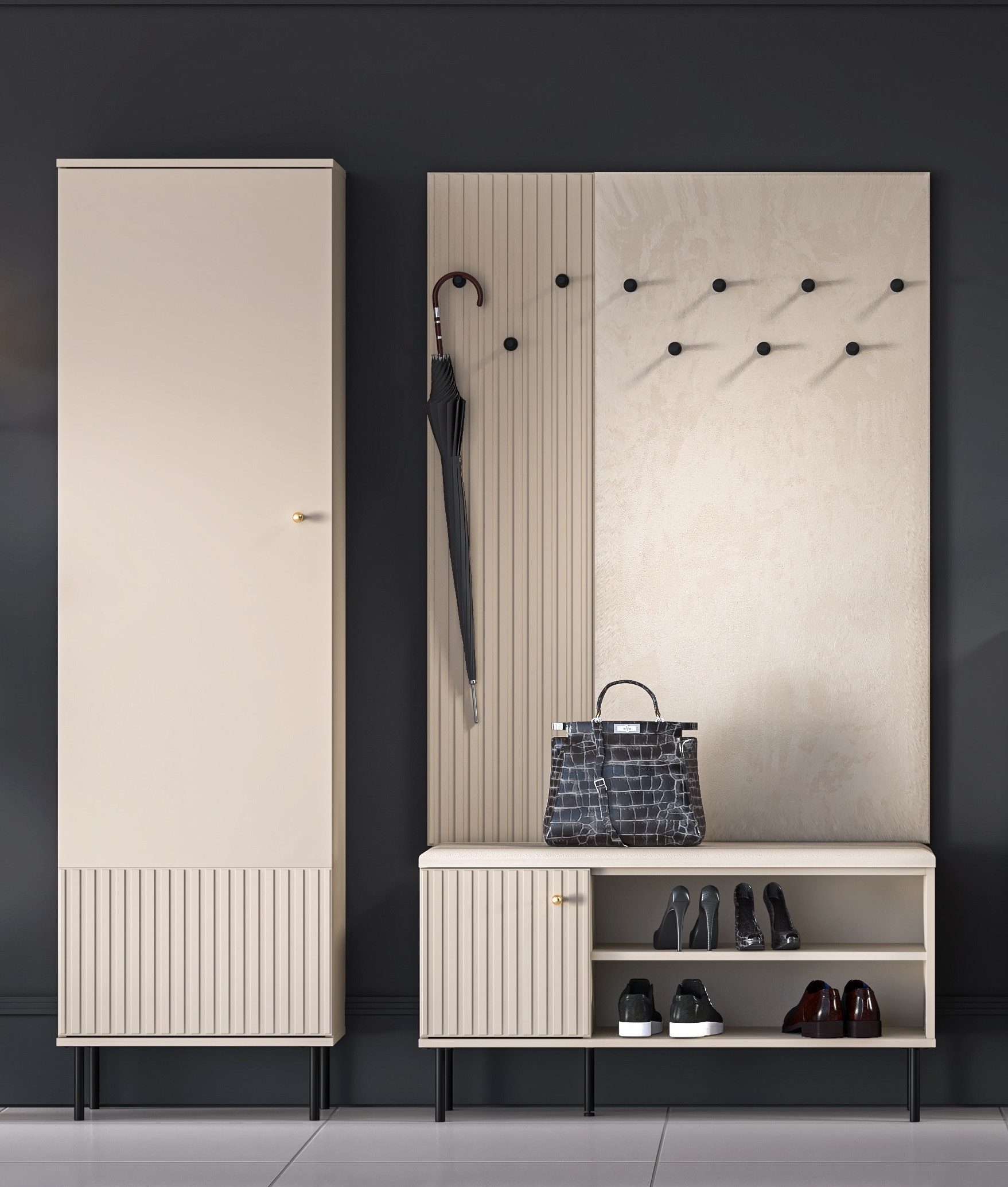 Set beinhaltet | Eintüriger Schrank, zwei Garderobenpaneele, eine Sitzbank |