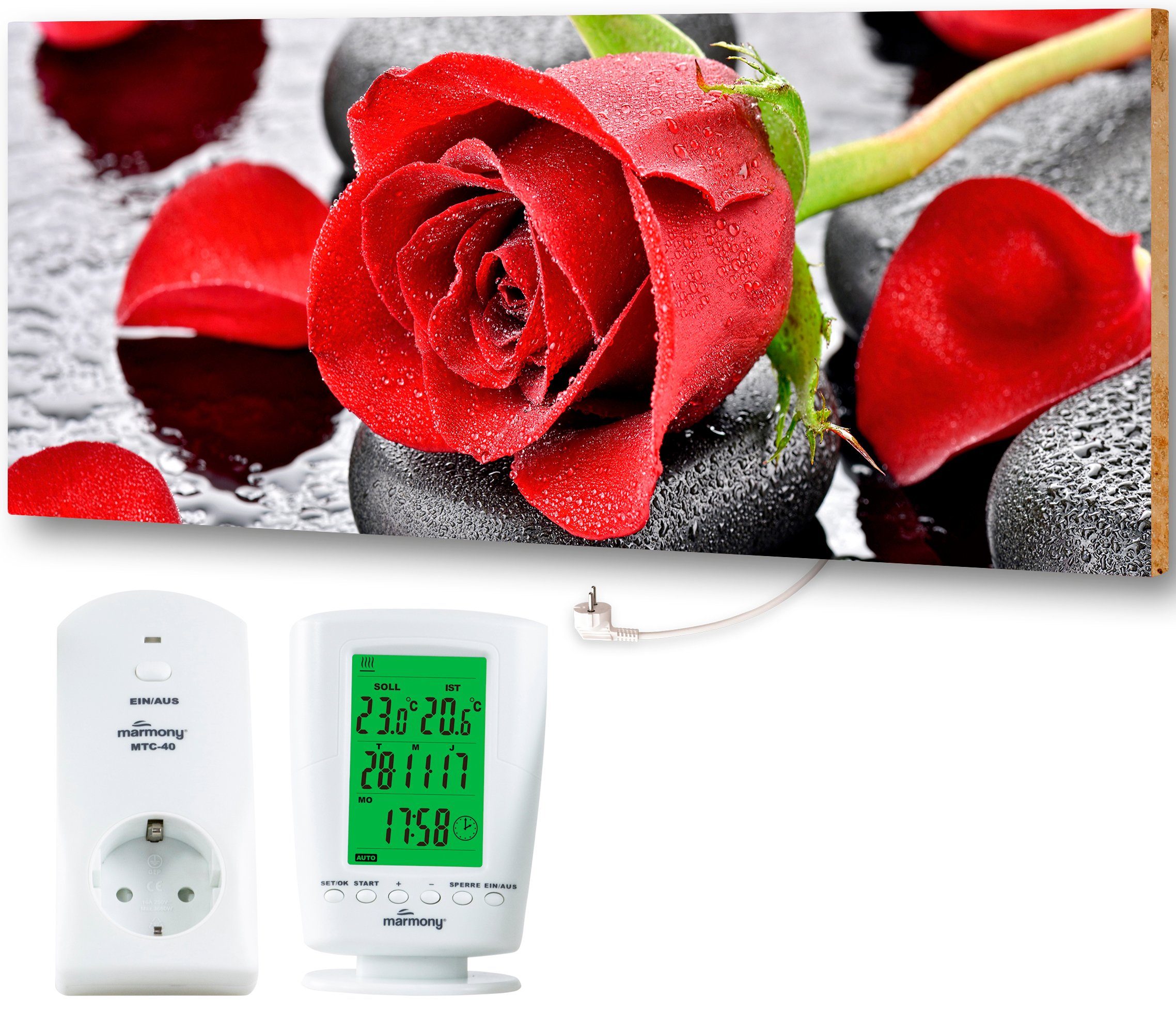 Впередe Vorteile | Geeignete Raumgröße ca. 25 m² hochwertiger Infrarot-Heizkörper aus deutscher Qualitätsfertigung intelligenter Funk-Thermostat beinhaltet Tages-/ Wochen-/ Urlaubs-/ Frostschutz- und Fenster offen - Funktionen |
