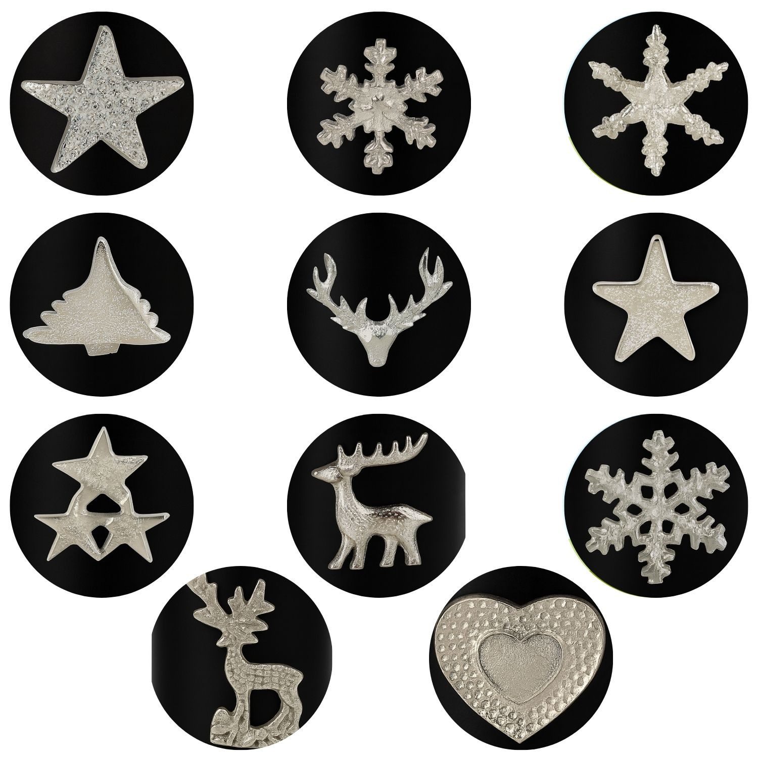 11er Set Kerzenpin Caloge 6x6cm verbindet Boho Vintage Stil mit moderner Eleganz. Handgefertigt aus hochwertigem Metall in Silberoptik wird jede Kerze im Adventskranz, Windlicht oder Kerzenhalter zu einem dekorativen Highlight.